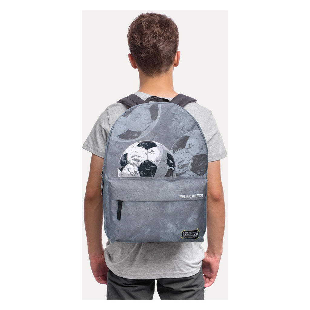 De Skooter collectie 'High Score' is een stoere collectie voor de echte winnaars! De tas is grijs van kleur en heeft de voetballen illustratie erop staan. De tas heeft een vervaagde look voor een vintage look. De rugtas heeft een aan de voorkant een groot voorvak. Op dit voorbeeld staat de tekst 'Werk hard. Voetballen.' De tas heeft een dubbele rits en verstelbare schouderbanden. De schouderbanden zijn gewatteerd zodat de tas altijd lekker zit. Aan de bovenkant heeft de tas een lus waar je hem aan kan hangen.