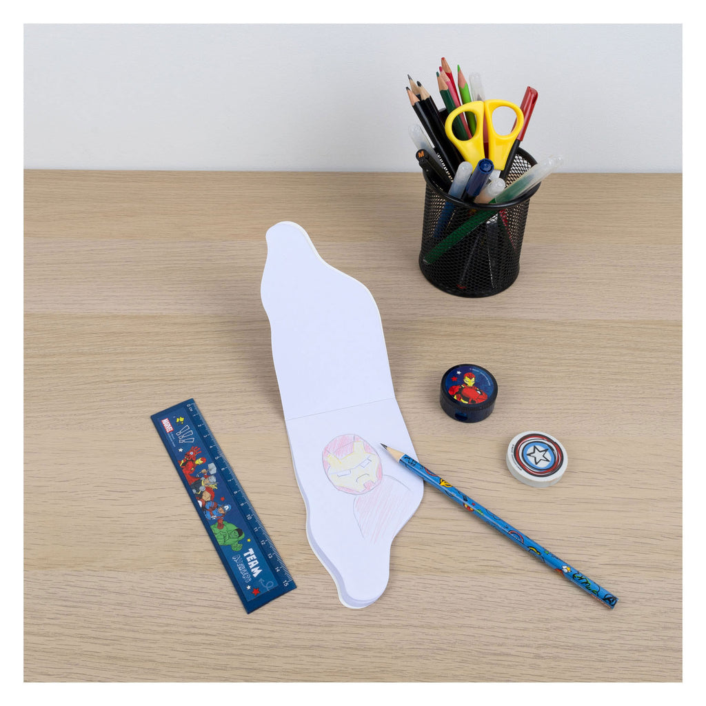 Schrijfset met Avengers-thema. 5-delige set, bestaande uit: potlood, puntenslijper, gum, liniaal en notitieblok. Geschikt voor kinderen vanaf 3 jaar oud.