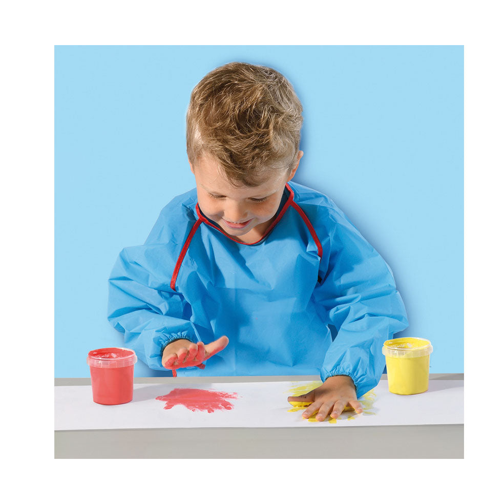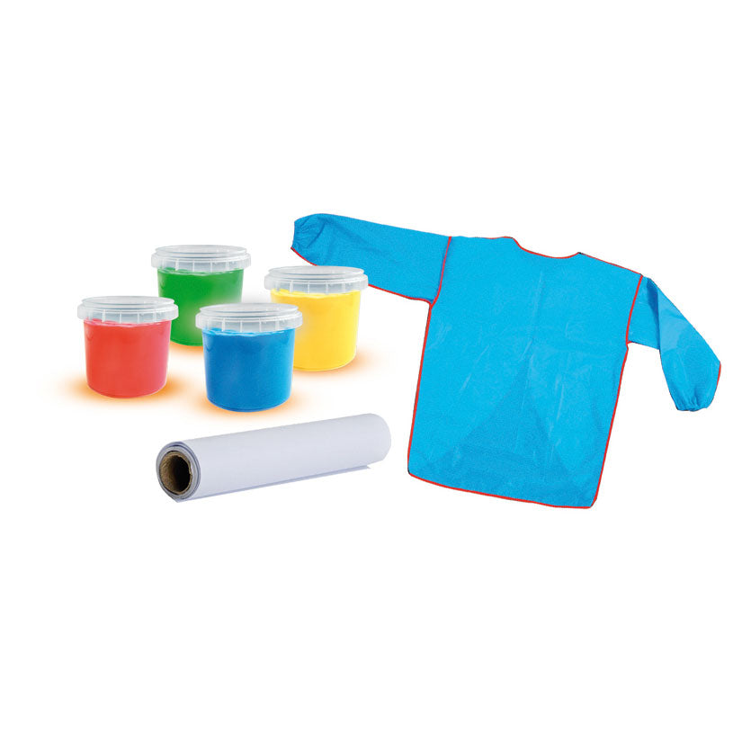 Maak je eerste vingerverfkunstwerken met deze complete set van SES. De set bevat een rolpapier en 4 afsluitbare potjes vingerverf in de kleuren rood, blauw, groen en geel. Verder vind je in de set een handige korte met elastische banden bij de handen, zodat je kleding schoon blijft. De verf is gemakkelijk uitwasbaar, dus lekker knoeien maar!