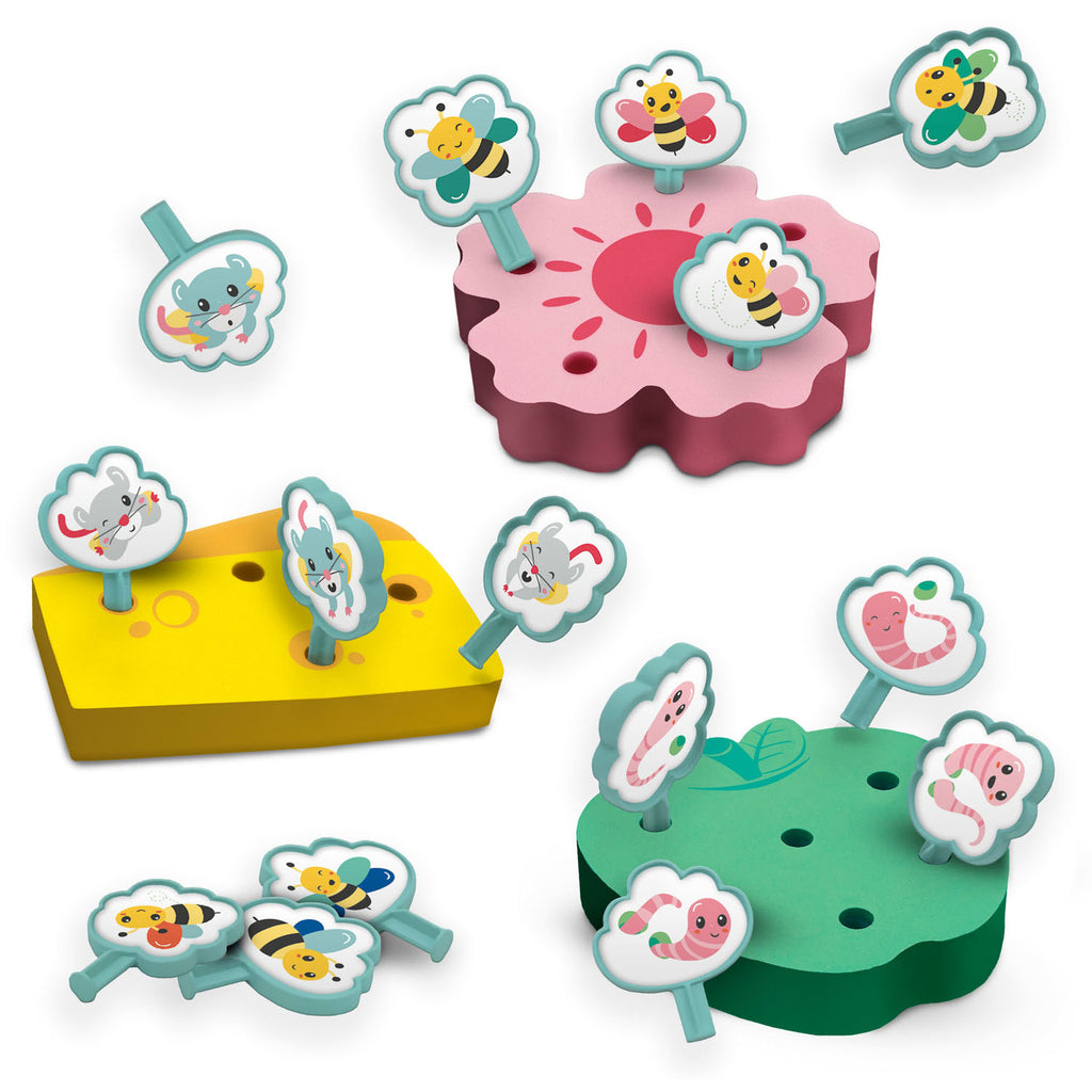 Deze activatieactiviteit is perfect voor kinderen vanaf 18 maanden om te leren tellen en scheiden. Het bevat kleurrijke rupsen en muizen die op verschillende voorwerpen kunnen worden geprikt. Jouw dromen zullen plezier hebben met het matchen van de juiste dieren met de juiste voorwerpen, zoals de muizen op de kaas en de rupsen op de appel. Dit spel stimuleert de ontwikkeling van je kindje op een speelse manier.