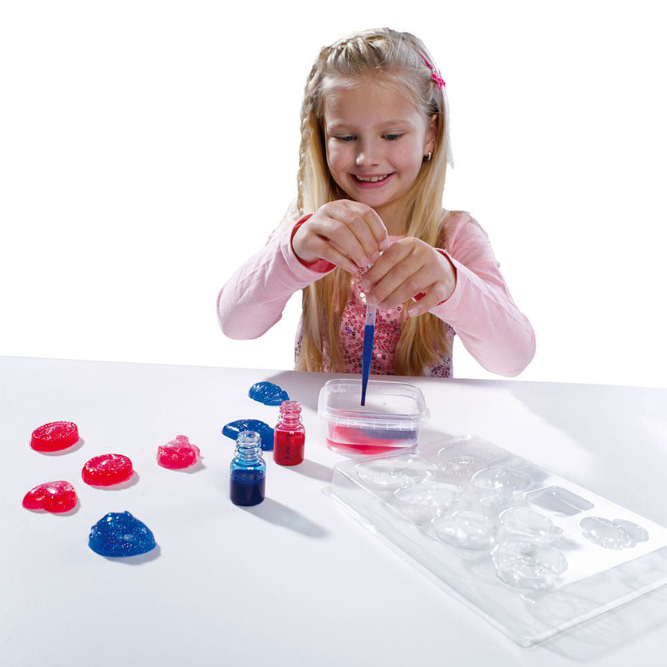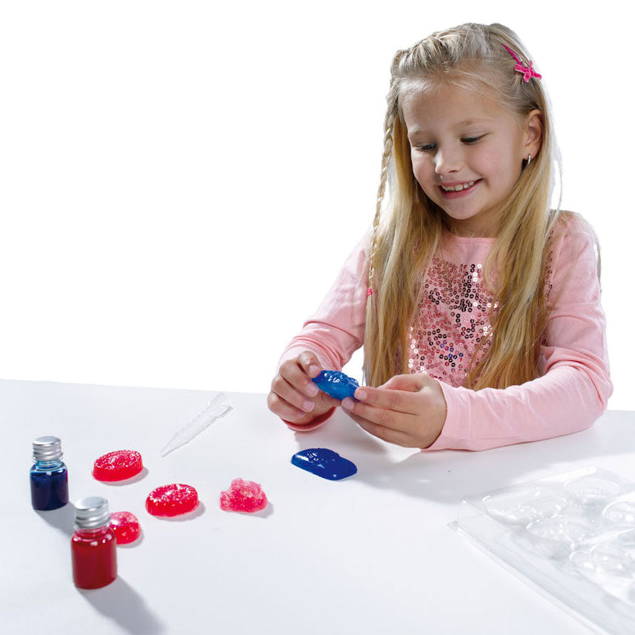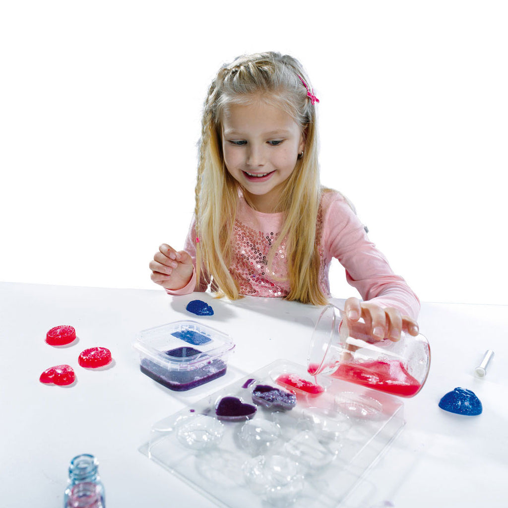 Met deze set kun je je eigen zeepjes maken in mooie en verschillende kleuren. De set bevat een mal met verschillende vormen, zeep die smelt, rode en blauwe pigmenten, glitterpoeder en een gebruiksaanwijzing.