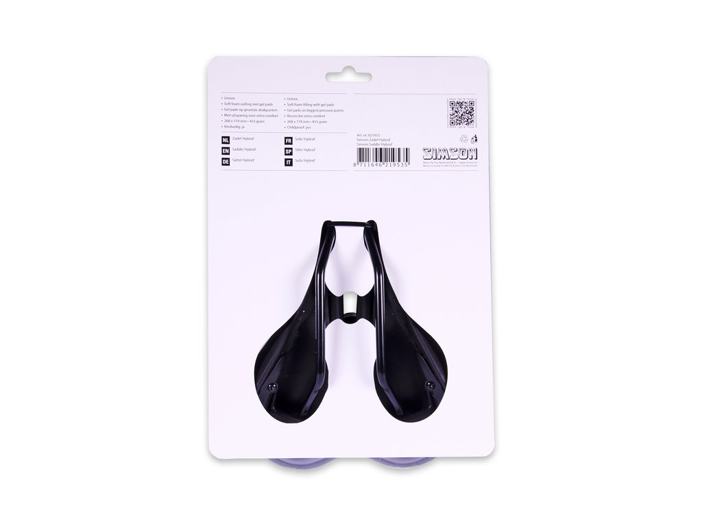 La selle Simson 'Hybrid' est une selle universelle spécialement conçue pour le cycliste 'Touring' et 'Trekking'. La selle Simson 'Hybrid' a une ouverture centrale qui assure une réduction de la pression autour de la zone pubienne. Le rembourrage en mousse souple et les coussinets en gel sur le siège assurent une assise confortable sur cette selle sportive. La selle convient parfaitement aux cyclistes qui transportent des enfants sur le dos, car il n'y a pas de pièces (comme des ressorts) sur la selle sur lesquelles les mains des enfants peuvent se blesser. La selle Simson 'Hybrid' a une longueur de 268 mm, une largeur de 174 mm, pèse 453 grammes et est de couleur noire. 21953 Selle 'Hybrid' La Simson Saddle Hybrid est une selle universelle. Il est spécialement conçu pour le cycliste Touring et Trekking. La selle a une ouverture centrale, qui soulage la pression autour de la zone pubienne. Le rembourrage en mousse souple et les coussinets en gel sur le siège assurent une assise confortable sur cette selle sportive. La selle convient parfaitement aux cyclistes qui transportent des enfants sur le dos, car il n'y a pas de pièces (comme des ressorts) sur la selle sur lesquelles les mains des enfants peuvent se blesser. Spécifications : Couleur : noir Genre : unisexe Matériau : cuir artificiel, mousse, acier Dimensions : 268 x 174 mm Poids : 453 grammes Montage : collier de selle La selle Simson Hybrid est une selle universelle spécialement conçue pour les cyclistes de randonnée et d'étirement. La selle Simson Hybrid est équipée d'une ouverture centrale qui assure une réduction de la pression autour de la zone pubienne. Le rembourrage en mousse souple et les coussinets en gel sur le siège assurent une assise confortable sur cette selle sportive. La selle convient parfaitement aux cyclistes qui transportent des enfants sur le dos, car il n'y a pas de pièces (comme des ressorts) sur la selle sur lesquelles les mains des enfants peuvent se blesser. La selle Simson Hybrid a une longueur de 268 mm, une largeur de 174 mm, pèse 453 grammes et est de couleur noire. Détails du produit: Rembourrage en mousse souple avec coussinets en gel