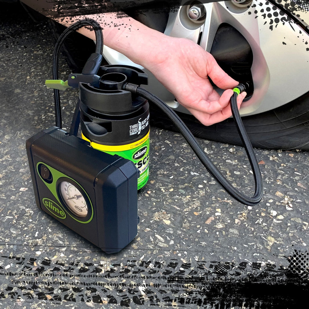 Het is hét praktische alternatief voor een reserveband. Het is niet nodig om de auto op te krikken of het ventiel te verwijderen: installeer het Slime afdichtmiddel, sluit de compressor aan en zet hem aan! Slime Smart Repair Plus dicht onmiddellijk lekke banden tot 6 mm. Er worden multifunctionele adapters geleverd voor rafts, ballen en andere opblaasbare producten. Niet giftig, niet gevaarlijk, niet brandbaar, niet corrosief en veilig voor bandensensoren. Navulling apart verkrijgbaar: art. 40P.050188. Let op: alleen voor gebruik in noodgevallen. Slime's Smart Repair Plus is ontworpen als tijdelijke formule voor personenauto's en moet binnen 3 dagen van 160 km worden verwijderd.