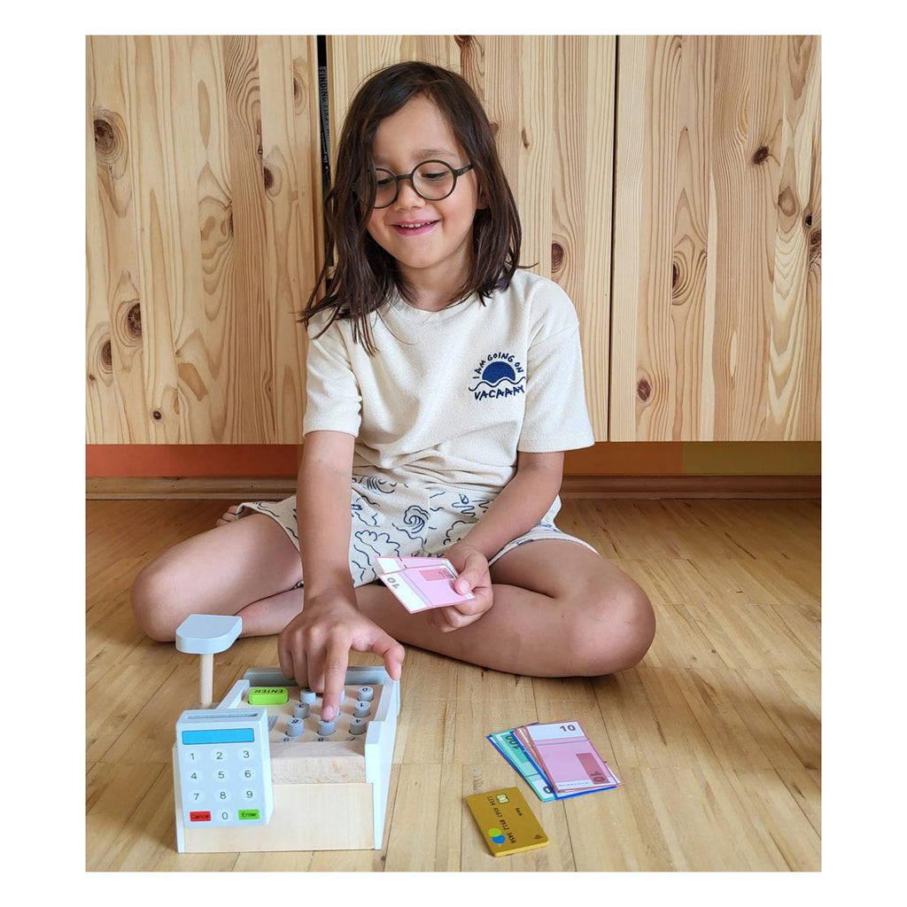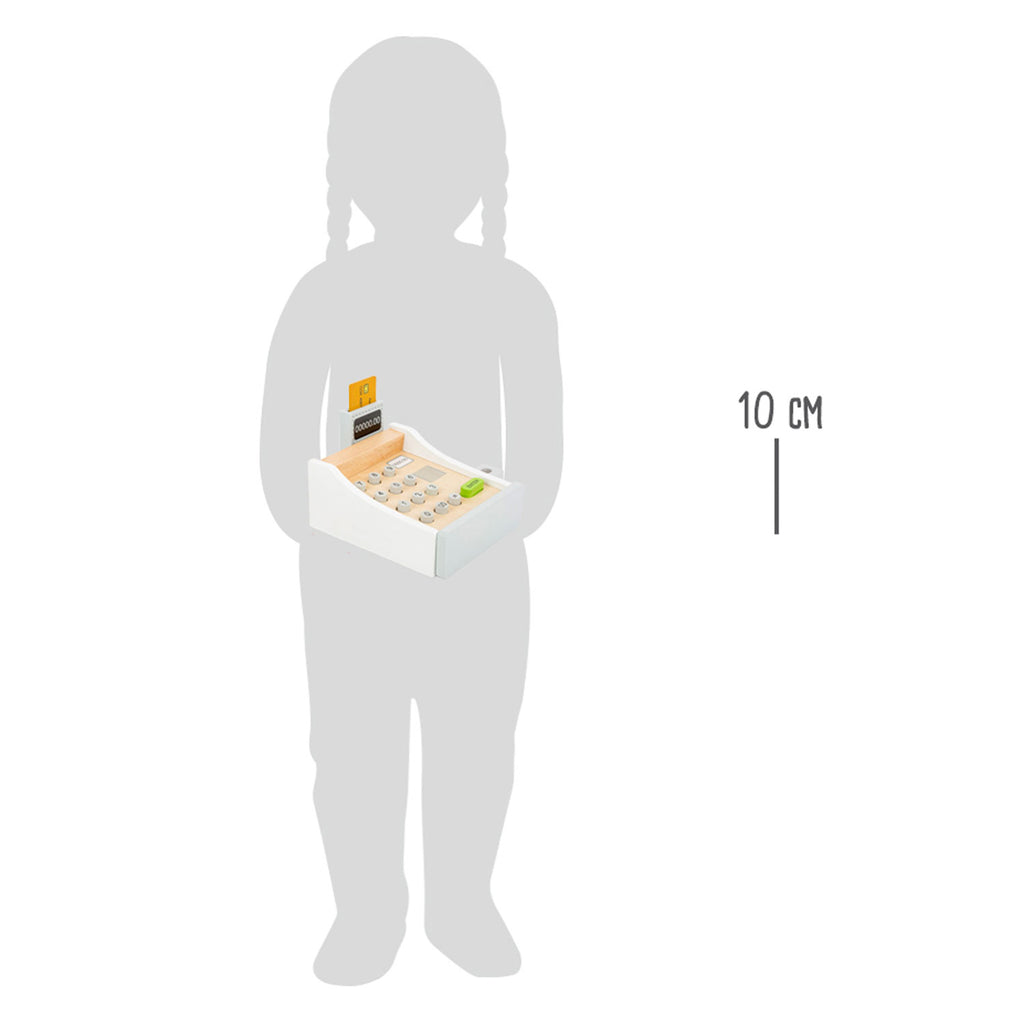Het geld stroomt binnen! Deze mooie houten kassa hoort thuis in elke overzichtelijke kinderspeelwinkel. Spelen met dit speelgoed traint een soort in het omgaan met geld en het begrijpen van prijzen. Het inbegrepen speelgeld en de houten creditcards passen in de uittrekbare geldlade. De prijs voor gekochte waren kan zelfs op het toetsenbord worden overgenomen. Wie is de volgende in de rij?