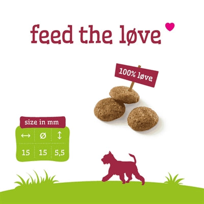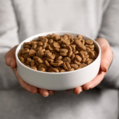 Samenstelling: Kippenmeel (20%), mais, gerst, sorghum, kippenvet (gestabiliseerd met natuurlijke tocoferolen), verse kip (4%), lamsmeel (4%), rijst, bietenpulp, gehydroliseerd eiwit, cellulose (2,5%), MSC-gecertificeerde vismeel (2%)*, biergist, MSC-gecertificeerde visolie (0,8%)*, cichorei (0,7%), vitamine en mineralenmix (bevat natriumhexametafosfaat 0,1%), glucosamine (0,03%). *Uit een MSC gecertificeerde duurzame visserij
