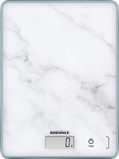 Met een hoog draagvermogen van 5 kg en een schaalverdeling van 1 g is de digitale keukenweegschaal Page Compact 300 met marmer look van ideaal voor dagelijks gebruik.Door het moderne design is het een bijzonder pareltje in uw keuken.De natuurlijke marmerlook zorgt voor een stijlvolle sfeer.Bijzonder praktisch is het 12 mm LCD-display, waardoor u gemakkelijk de cijfers kunt aflezen.De weegschaal kan gemakkelijk bediend worden met de conventionele Soehhnle-sensoraanraking.Uiteraard is de huishoudschaal voorzien van een uitschakelfunctie en is zeer efficiënt gebruiken.U kunt de weegfunctie om de ingrediënten gemakkelijk te wegen tijdens het bakken of koken in een kom.Om ervoor te zorgen dat de Page Compact 300 stevig staat tijdens het werken, is hij uitgerust met antislipvoetjes.Met zijn extra platte, compact ontwerp kan hij ook ruimtebesparend worden opgeborgen of met de ophangfunctie aan de muur worden bevestigd.Batterijen zijn al opgenomen, zodat u de digitale weegschaal direct in gebruik kunt nemen.Deze gaan meer dan twee jaar mee als je het apparaat twee keer per dag gebruikt.Het Het batterijvak is vastgeschroefd en kindveilig verpakt.
