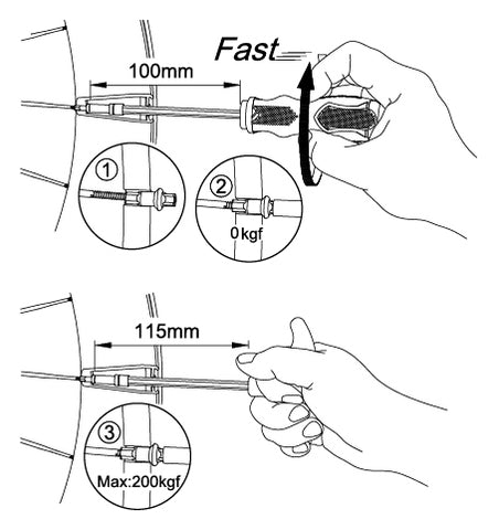 Installez les mamelons à l'aide de la clé à manche de tournevis et serrez à l'aide de la clé à manche en T #12D3 · Avec poignée de forme ergonomique et repère d'intervalle · Pour une torsion et une tension très rapides #12D7 . Poignée en T conçue pour une tension de rayon supérieure à 60 N