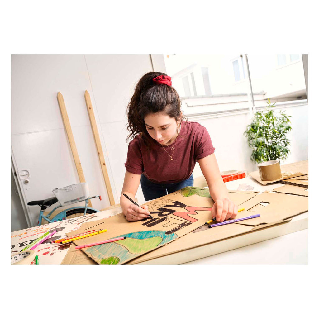 Deze set van 15 STABILO pennen is perfect voor het maken van lijnen en grote vlakken. De pennen hebben een robuust rond punt met een schrijfbreedte van ongeveer 1 mm. Ze kunnen tot wel 24 uur zonder dop blijven liggen zonder uit te drogen, waardoor je ze altijd bij de hand kunt hebben.