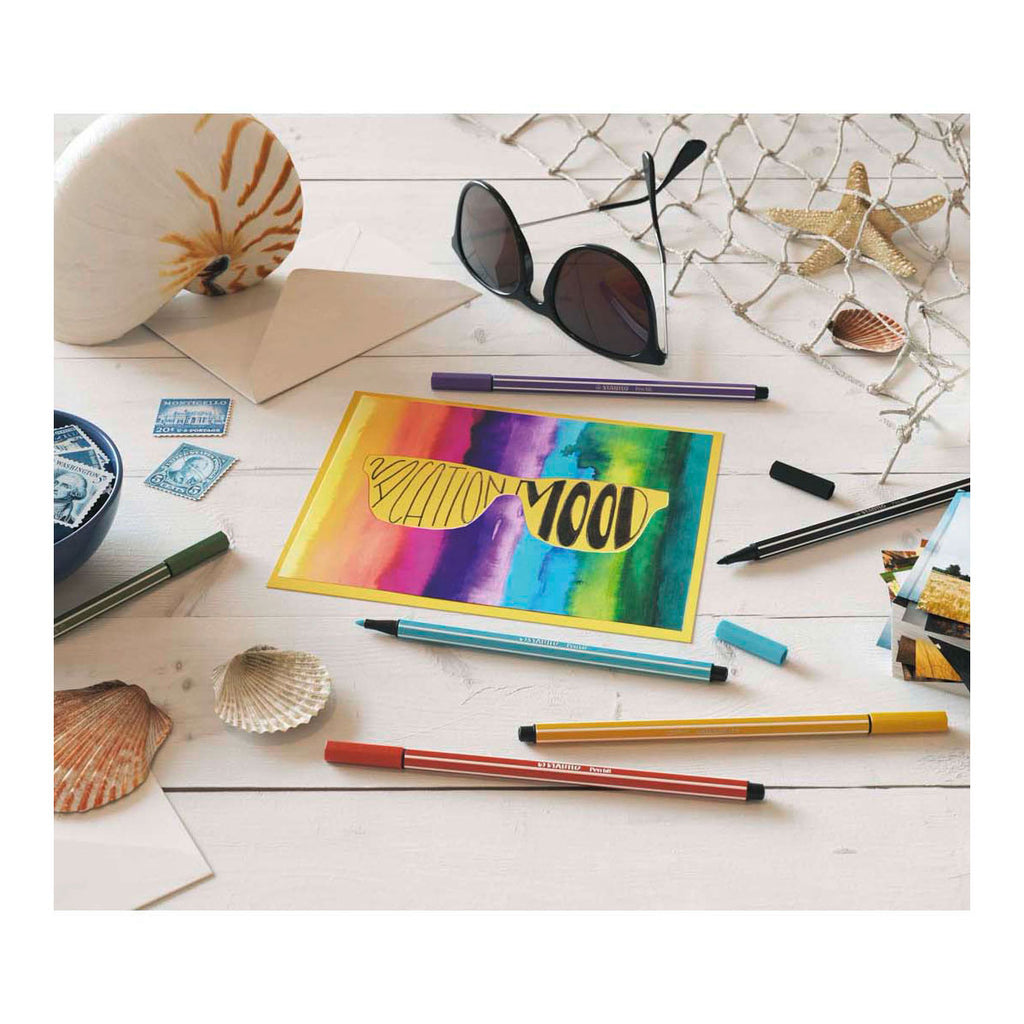 De beste viltstift die je kunt vinden. De STABILO Pen 68 is een viltstift van topkwaliteit, voor het allerbeste resultaat. verkrijgbaar in 65 prachtige, heldere kleuren, inclusief 6 fluorescerende kleuren. Of je nu een professionele kleurt of hobby bent, deze top viltstift is perfect voor jou! · Viltstift van zeer hoge kwaliteit · diverse in talrijke kleuren · Robuuste drukbestendige penpunt · Schrijfbreedte ca. 1 mm · Reukloze inkt op waterbasis · Tast toner en watervaste inkt niet aan · Kan tot 24 uur zonder dop zonder uit te drogen · Hoge glans en kleurintensiteit · Alle kleuren los verkrijgbaar · Mengbaar met water voor mooie aquarel effecten en kleuren blenden De STABILO Pen 68 viltstiften zijn viltstiften van de allerhoogste kwaliteit en bieden oneindig veel kleurmogelijkheden. De punt is 1 mm dik voor krachtige lijnen en de kleuren van vlakken. Het robuuste punt zorgt voor een regelmatige inktafgifte. De viltstift kan 24 uur zonder dop zonder dat de punt uitdroogt. De kleuren zijn intens en zeer goed dekkend. De inkt is op waterbasis en geurloos. Alle kleuren zijn te mengen met water, waardoor er prachtige aquareleffecten en onvermijdelijke kleur verlopen mee kunnen worden gemaakt. Voor het mooiste aquarelresultaat breng je de gewenste kleur aan op een stukje folie of een schoteltje en vervolgens pak je de kleur op met een nat kwastje. Bij gebruik met water is het aan te raden om papier of karton te gebruiken. Alle kleuren kunnen met elkaar gemengd worden, waardoor elke willekeurige kleur kan worden gemaakt. Door regelmatig met een vochtig wattenstaafje over de grote oppervlakken te lastig mooie ontstaan, opvallende kleurovergangen. De kwaliteit van het papier bepaalt ook de kwaliteit van het mengen met water. Niet geschikt voor kinderen onder de 3 jaar, vanwege verstikkingsgevaar door kleine onderdelen.