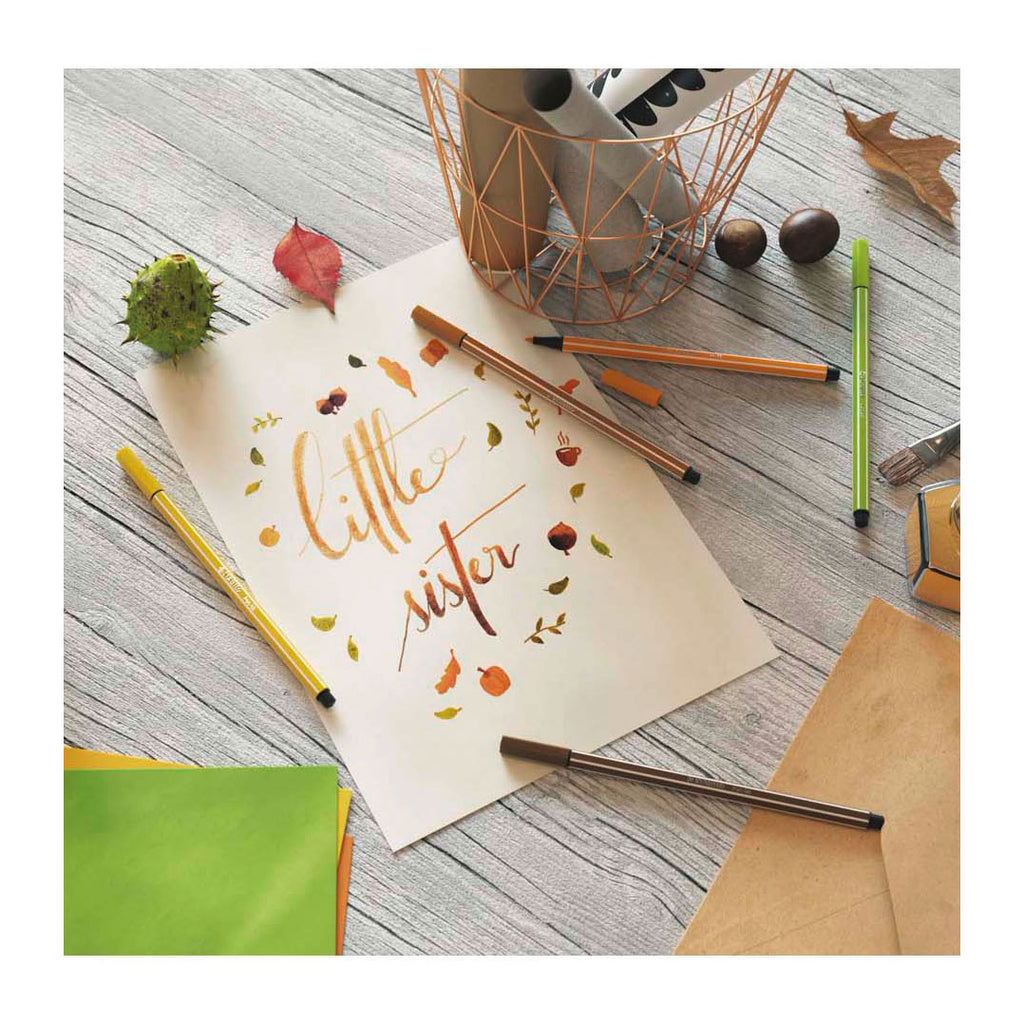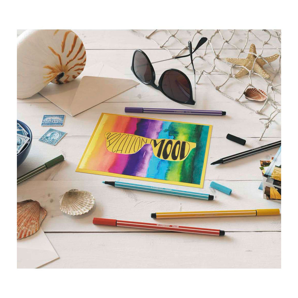 De beste viltstift die je kunt vinden. De STABILO Pen 68 is een viltstift van topkwaliteit, voor het allerbeste resultaat. verkrijgbaar in 65 prachtige, heldere kleuren, inclusief 6 fluorescerende kleuren. Of je nu een professionele kleurt of hobby bent, deze top viltstift is perfect voor jou! · Viltstift van zeer hoge kwaliteit · diverse in talrijke kleuren · Robuuste drukbestendige penpunt · Schrijfbreedte ca. 1 mm · Reukloze inkt op waterbasis · Tast toner en watervaste inkt niet aan · Kan tot 24 uur zonder dop zonder uit te drogen · Hoge glans en kleurintensiteit · Alle kleuren los verkrijgbaar · Mengbaar met water voor mooie aquarel effecten en kleuren blenden De STABILO Pen 68 viltstiften zijn viltstiften van de allerhoogste kwaliteit en bieden oneindig veel kleurmogelijkheden. De punt is 1 mm dik voor krachtige lijnen en de kleuren van vlakken. Het robuuste punt zorgt voor een regelmatige inktafgifte. De viltstift kan 24 uur zonder dop zonder dat de punt uitdroogt. De kleuren zijn intens en zeer goed dekkend. De inkt is op waterbasis en geurloos. Alle kleuren zijn te mengen met water, waardoor er prachtige aquareleffecten en onvermijdelijke kleur verlopen mee kunnen worden gemaakt. Voor het mooiste aquarelresultaat breng je de gewenste kleur aan op een stukje folie of een schoteltje en vervolgens pak je de kleur op met een nat kwastje. Bij gebruik met water is het aan te raden om papier of karton te gebruiken. Alle kleuren kunnen met elkaar gemengd worden, waardoor elke willekeurige kleur kan worden gemaakt. Door regelmatig met een vochtig wattenstaafje over de grote oppervlakken te lastig mooie ontstaan, opvallende kleurovergangen. De kwaliteit van het papier bepaalt ook de kwaliteit van het mengen met water. Niet geschikt voor kinderen onder de 3 jaar, vanwege verstikkingsgevaar door kleine onderdelen.