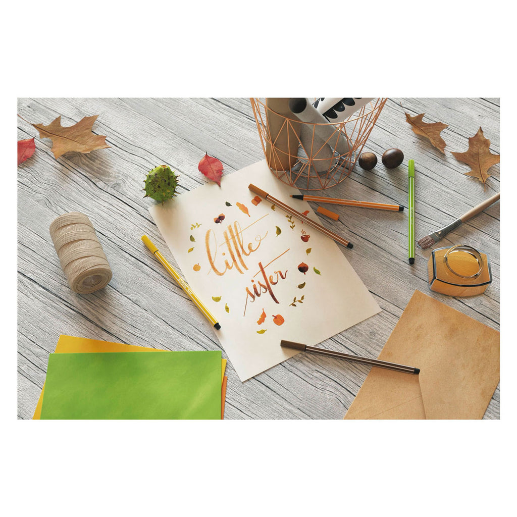 De beste viltstift die je kunt vinden. De STABILO Pen 68 is een viltstift van topkwaliteit, voor het allerbeste resultaat. verkrijgbaar in 65 prachtige, heldere kleuren, inclusief 6 fluorescerende kleuren. Of je nu een professionele kleurt of hobby bent, deze top viltstift is perfect voor jou! · Viltstift van zeer hoge kwaliteit · diverse in talrijke kleuren · Robuuste drukbestendige penpunt · Schrijfbreedte ca. 1 mm · Reukloze inkt op waterbasis · Tast toner en watervaste inkt niet aan · Kan tot 24 uur zonder dop zonder uit te drogen · Hoge glans en kleurintensiteit · Alle kleuren los verkrijgbaar · Mengbaar met water voor mooie aquarel effecten en kleuren blenden De STABILO Pen 68 viltstiften zijn viltstiften van de allerhoogste kwaliteit en bieden oneindig veel kleurmogelijkheden. De punt is 1 mm dik voor krachtige lijnen en de kleuren van vlakken. Het robuuste punt zorgt voor een regelmatige inktafgifte. De viltstift kan 24 uur zonder dop zonder dat de punt uitdroogt. De kleuren zijn intens en zeer goed dekkend. De inkt is op waterbasis en geurloos. Alle kleuren zijn te mengen met water, waardoor er prachtige aquareleffecten en onvermijdelijke kleur verlopen mee kunnen worden gemaakt. Voor het mooiste aquarelresultaat breng je de gewenste kleur aan op een stukje folie of een schoteltje en vervolgens pak je de kleur op met een nat kwastje. Bij gebruik met water is het aan te raden om papier of karton te gebruiken. Alle kleuren kunnen met elkaar gemengd worden, waardoor elke willekeurige kleur kan worden gemaakt. Door regelmatig met een vochtig wattenstaafje over de grote oppervlakken te lastig mooie ontstaan, opvallende kleurovergangen. De kwaliteit van het papier bepaalt ook de kwaliteit van het mengen met water. Niet geschikt voor kinderen onder de 3 jaar, vanwege verstikkingsgevaar door kleine onderdelen.
