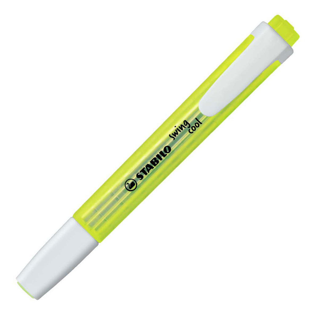 Set van 4 STABILO Swing Cool markeerstiften (geel, groen, blauw en roze). Met deze markeerstift kun je high-lighten, tekenen van kleuren. Met STABILO Anti-uitdroogtechnologie; kan tot 4 uur zonder dop zonder uit te drogen, ideaal voor significant werken. Inkt op waterbasis, perfect voor onderweg.