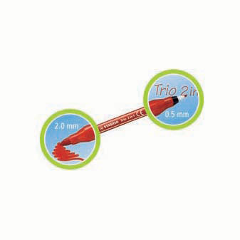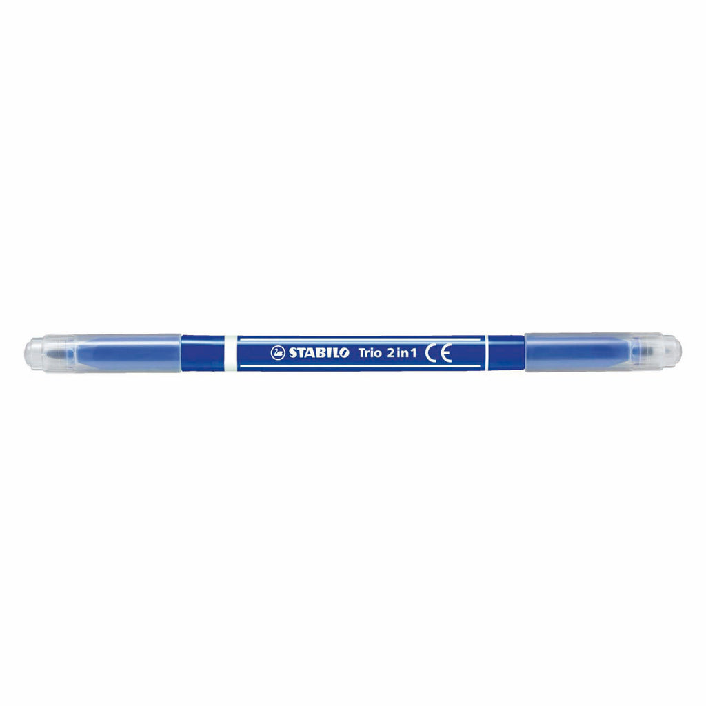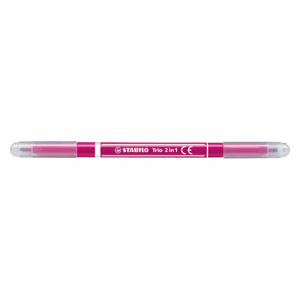 Viltstift en fineliner in één - STABILO Trio 2 in 1 - 10 stuks met 10 verschillende kleuren Dat is dubbel plezier! De STABILO Trio 2 in 1 is een fineliner en viltstift in één. Met zijn praktische dubbele gespeeld hij veel ruimte in het etui. De ideale probleemoplosser voor iedereen die op school en thuis binnen één seconde van schrijven naar schilderen en aangedreven wil schakelen. · Dubbele punt · Dunne punt (0,5 mm) voor schrijven en tekenen · Dikke punt (2,0 mm) voor kleuren · Ergonomische driekantige gripzone aan beide kanten voor optimale grip · Uitwasbare inkt