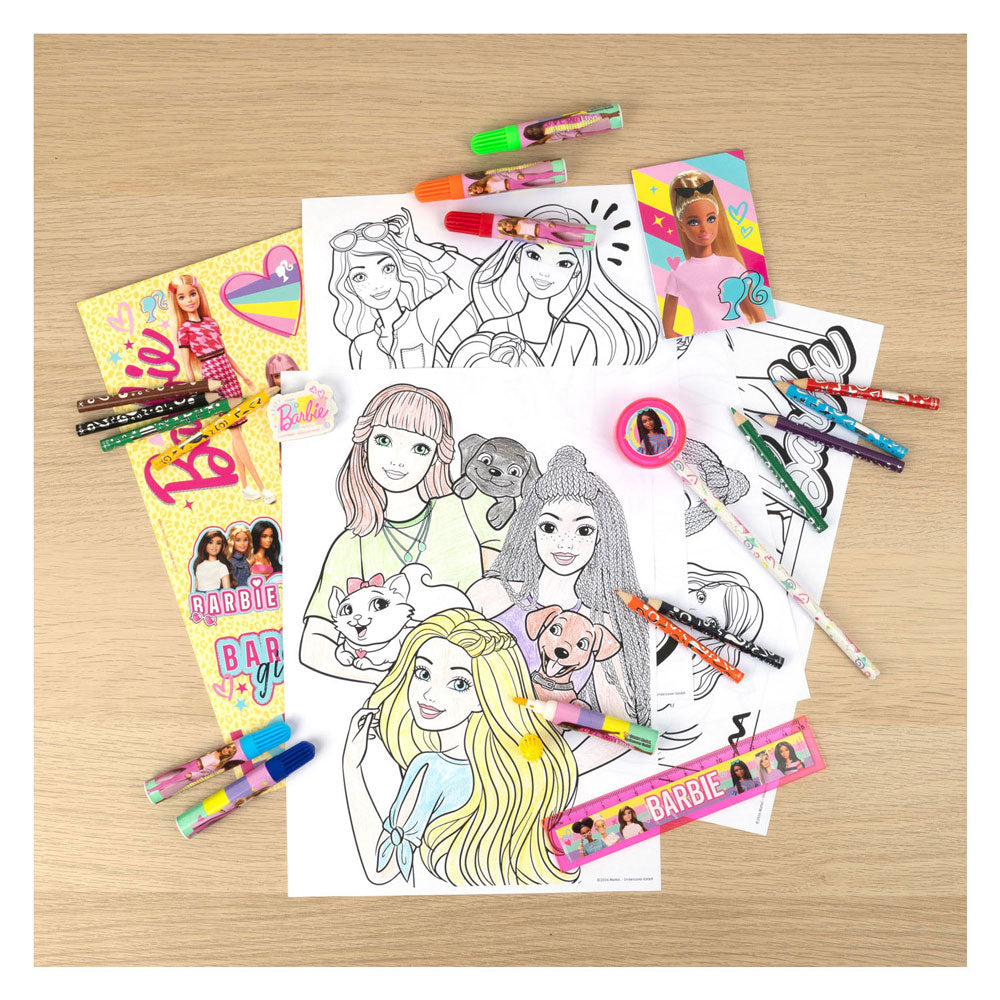 Barbie schrijfwarentoren boordevol leuke kleur- en schrijfartikelen! Inhoud • Notitieblok • Gum en puntenslijper • 4 kleurplaten • 10 stickers • 10 kleine kleurpotloden • Liniaal • Grijs potlood • 6 mini stiften Geschikt voor kinderen van 3 jaar en ouder.