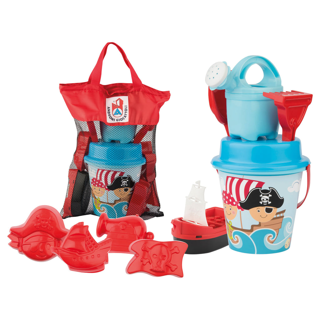 Speel een echte piratenavontuur met deze strandset piraat. In de handige dragers vind je een emmertje met een vrolijke piratenprint rondom. Op de emmer vind je een zeef om het zand mee te zeven. Met de 4 zandvormen maak je de mooiste figuren van een schip, een kanon, een piratenvlag en een piraatje van het zand. Met het schepje en het harkje schep je zand om je schat te begraven of om een gracht te maken. Vul de gracht met het gietertje met water en laat het piratenschip erin varen. Schip ahoi! Met al deze piratenspulletjes heb je de hele stranddagplezier!