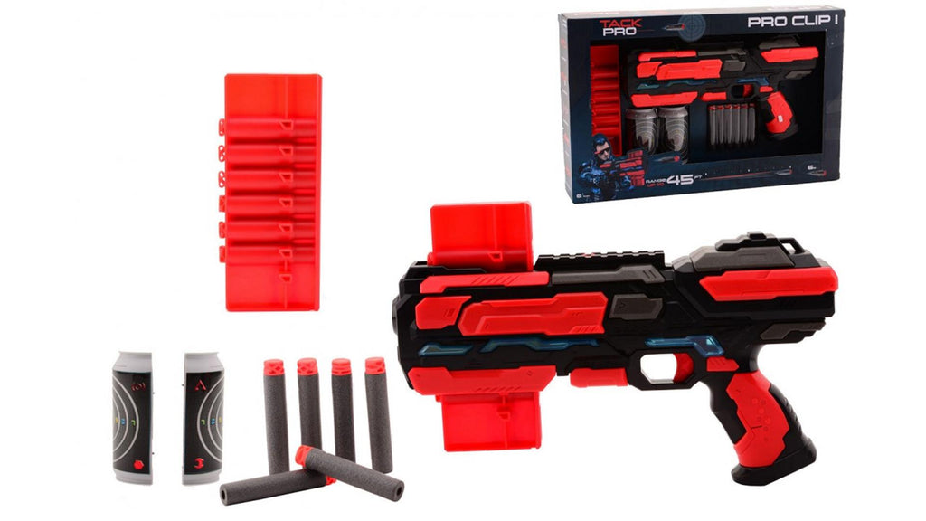 Ga op weg naar de overwinning met de Tack Pro Stom Clip III! Met de 14 darts kun je tot wel 18 meter schieten! Dit stoere speelgoedpistool heeft een heel magazijn aan darts, je kunt tot wel 6 keer schieten zonder te vullen! Plaats het gevulde magazijn in het speelgoedpistool, trek de lader naar achteren en haal de trekker over! Het magazijn verspringt elke keer dat je de trekker naar achter trekt. Het speelgoedpistool is 29 centimeter lang en gemaakt van kunststof.