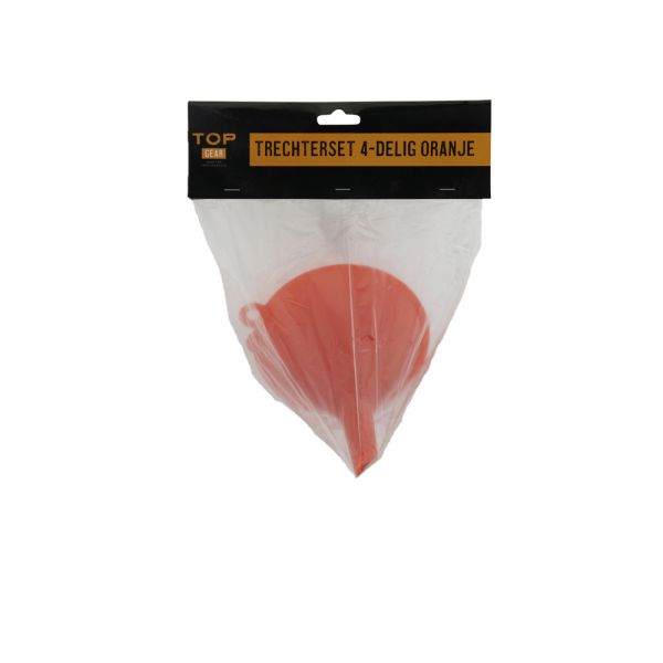 Trechterset 4-delig oranje Handige set bestaande uit 4 trechters met verschillende diameters: 45, 65, 85 en 105 mm. Materiaal: kunststof.