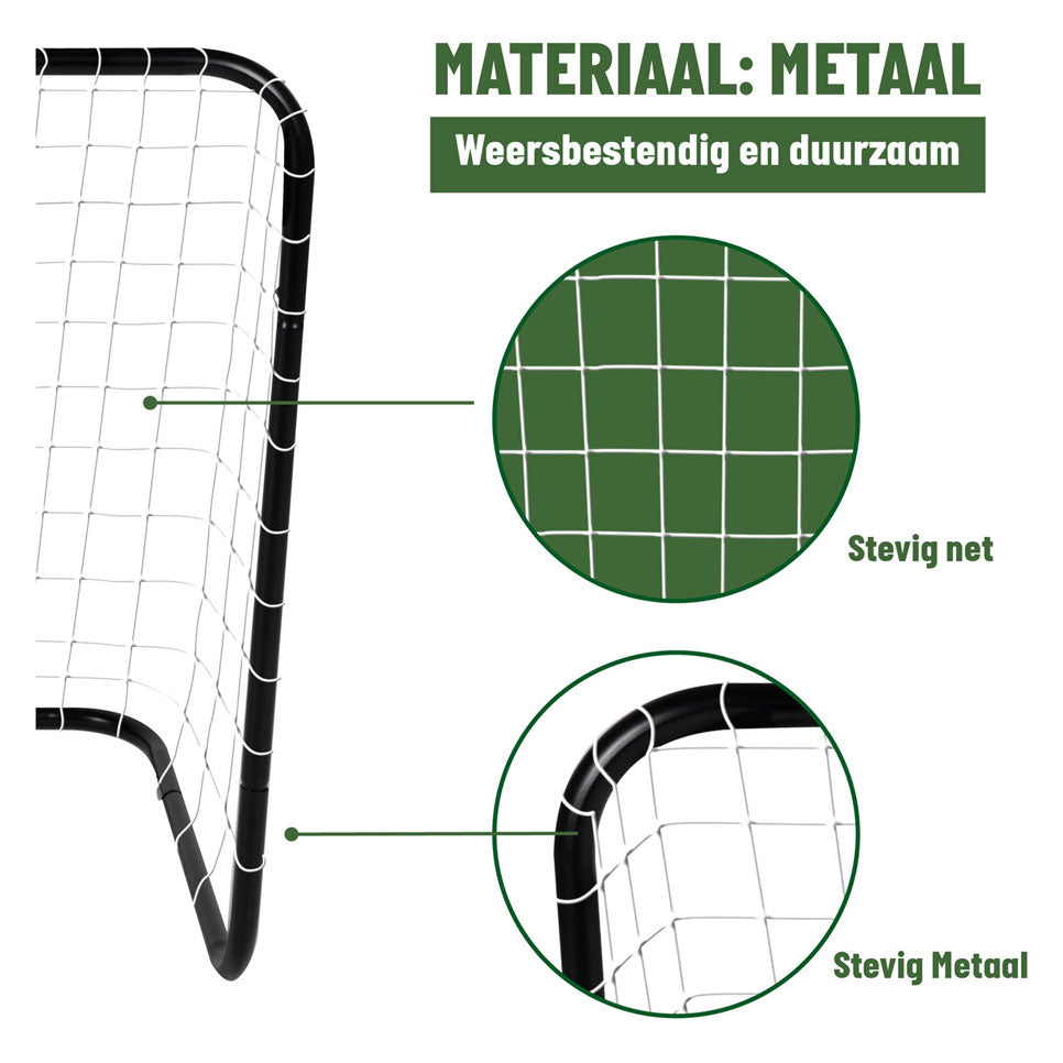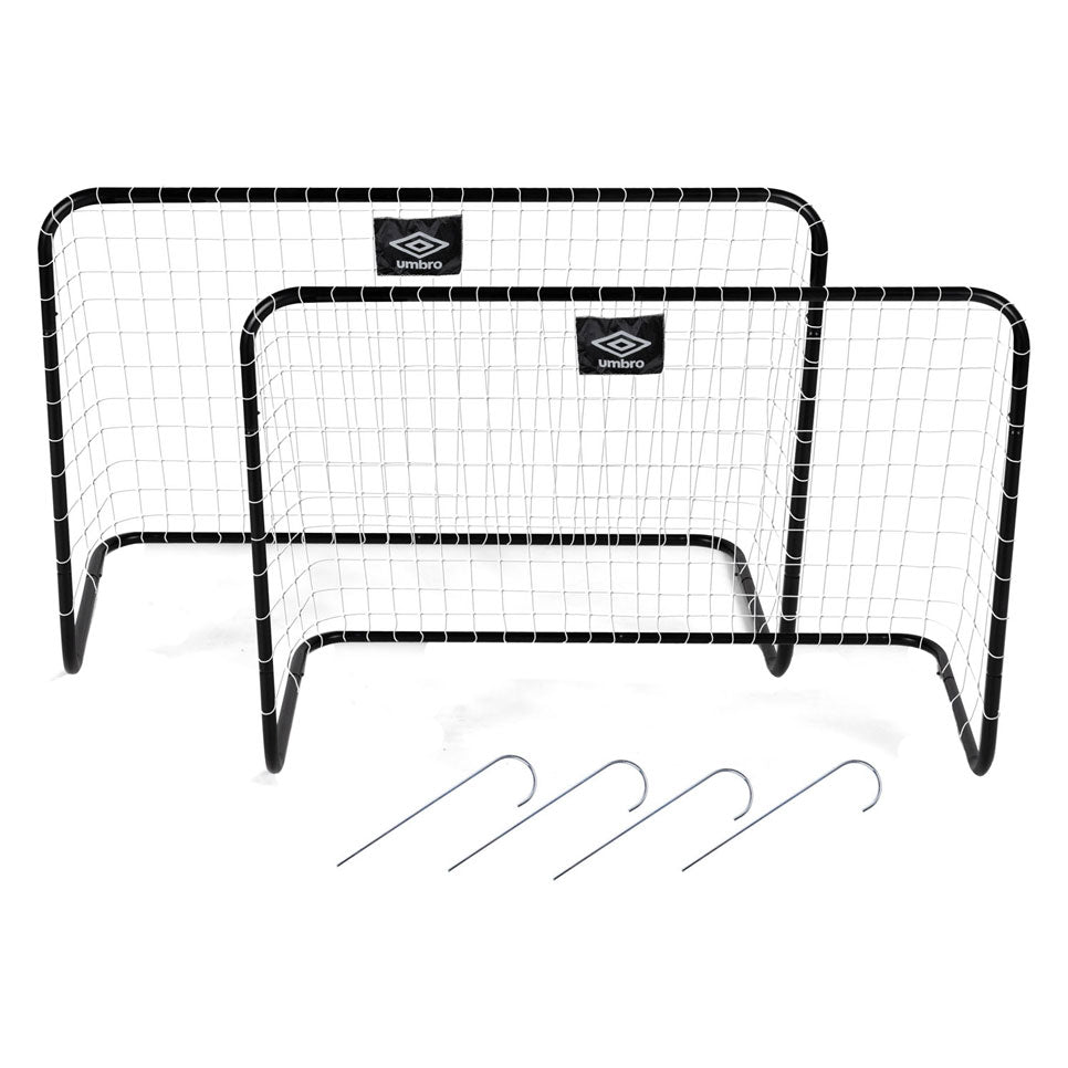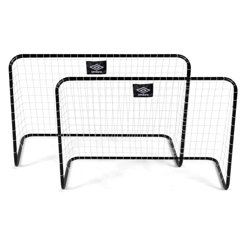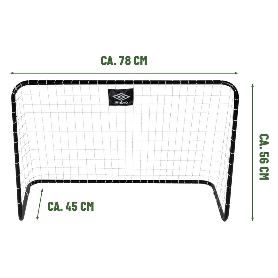 Set van 2 Umbro voetbaldoeltjes van 78 x 56 x 45 cm groot. De doelen zijn gemaakt van stevig, zwart metaal en hebben een wit net. Regen- en windbestendig en zowel binnen als buiten te gebruiken.