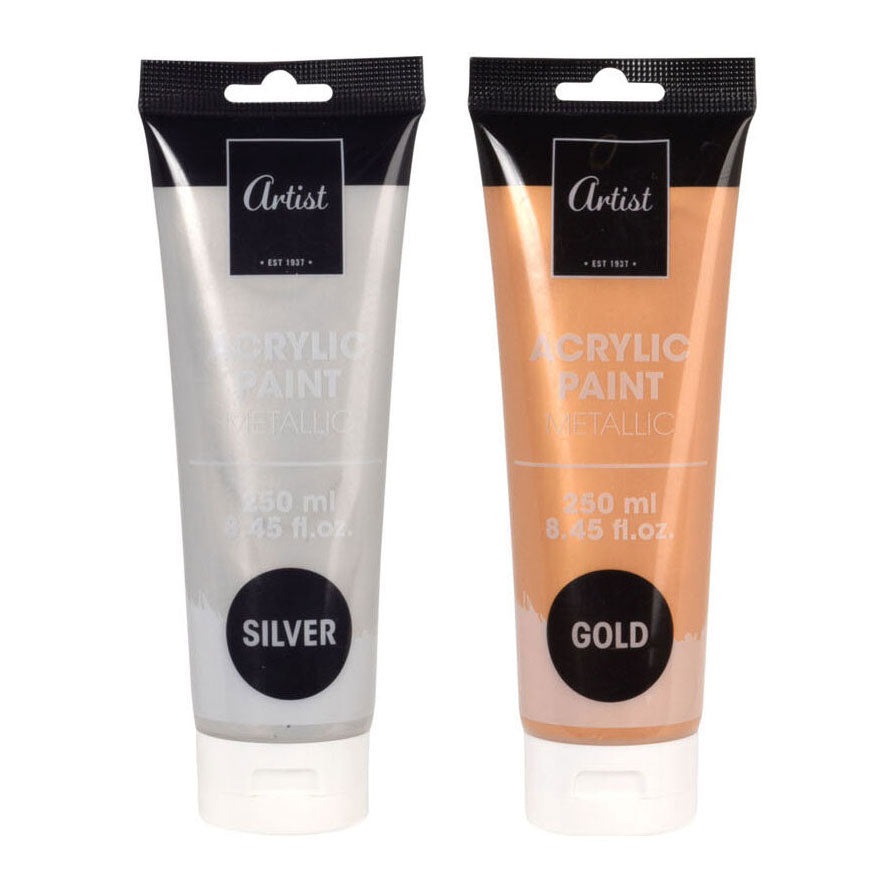 Tube met 250 ml metallic acrylverf. Wordt geleverd in de kleur zilver of goud.