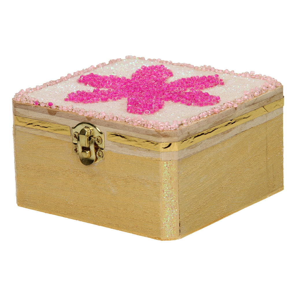 Een prachtig houten sieradenkistje om zelf te formaat! Dit kistje heeft een goudkleurige sluiting en biedt de perfecte mogelijkheid om je creativiteit tot uiting te brengen. Voeg je favoriete kleuren toe en maak het kistje uniek en persoonlijk. Het is exclusief versieringenspullen, zodat je zelf kunt kiezen welke materialen je wilt gebruiken.