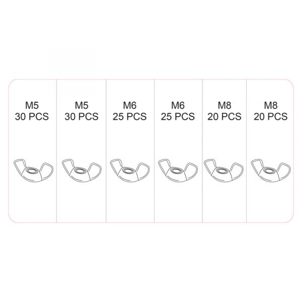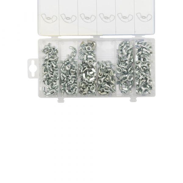 Assortiment vleugelmoeren 150 delig Bestaande uit: 30 x M5 x 24 30 x M5 x 32 25 x M6 x 20 25 x M6 x 28 20 x M8 x 18 20 x M8 x 24 Verpakt in kunststof doos.