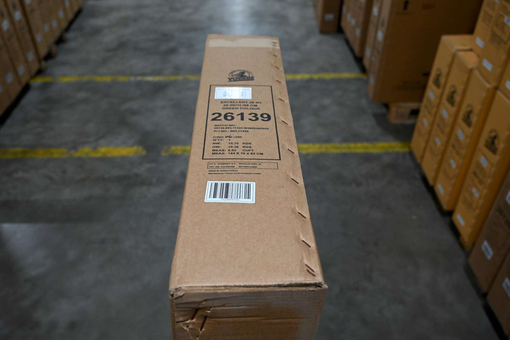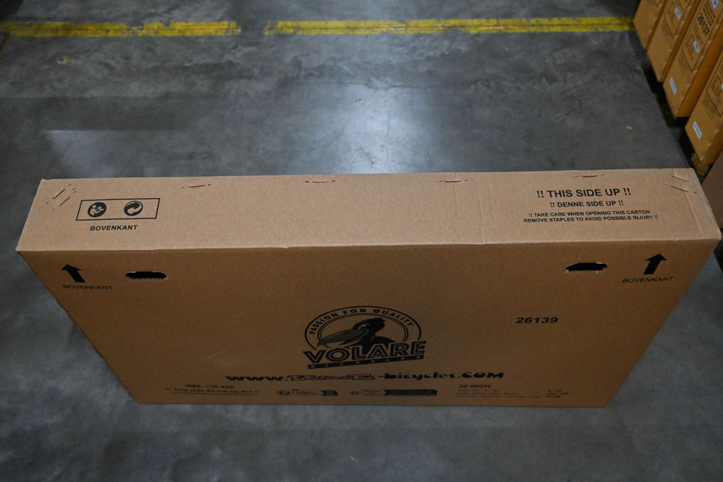 Fietsen verpakken we in een stevige doos zodat ze tijdens het vervoer niet beschadigd raken. Bij levering staat het stuur een slag gedraaid en zitten de pedalen er nog niet op.