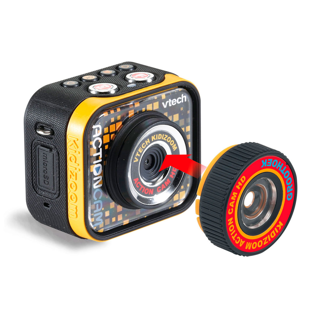 De VTech Kidizoom Action Cam HD wordt geleverd met negen accessoires, waaronder een waterdichte behuizing, kamerahouder, groothoeklens, drijvende handgreep, fietsbevestiging, montagestuk, platte montageplaat, micro-USB-oplaadkabel, armband en handleiding. Deze camera biedt ook leerzame spellen voor extra speelplezier. Het interne geheugen van 128 MB kan uitgebreid worden met een microSD-kaart (tot maximaal 32GB, niet inbegrepen). De camera heeft een oplaadbare accu en een stevig en duurzaam ontwerp. Automatische uitschakeling is ook aanwezig.