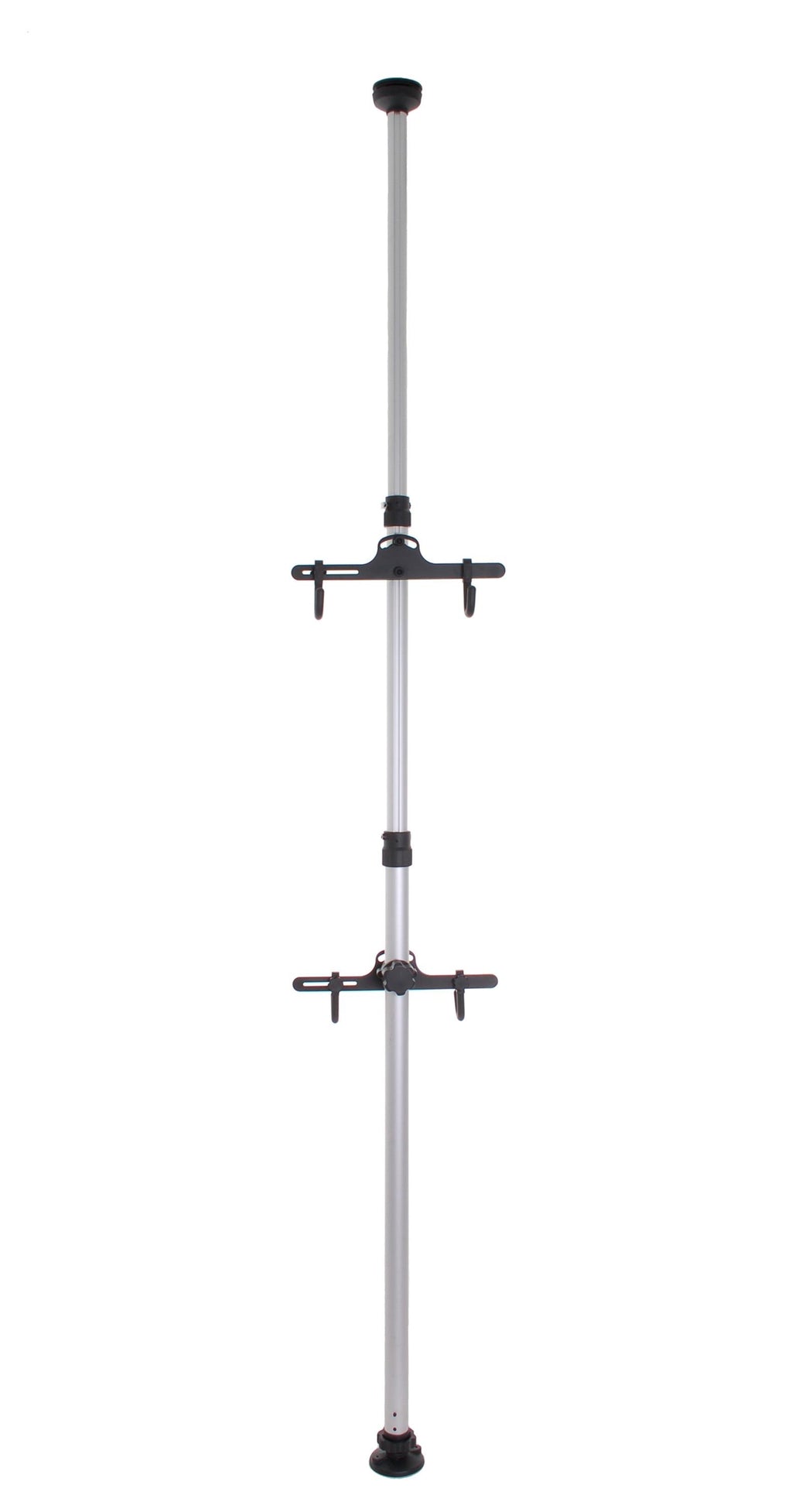 Support de salle d'exposition robuste pour accrocher 2 vélos. Le mât et les supports de la salle d'exposition sont en aluminium et peuvent être utilisés dans des pièces d'une hauteur de 180 à 400 centimètres. Le poteau peut être facilement ajusté pour un serrage optimal entre le sol et le plafond. Matériau : aluminium très résistant
