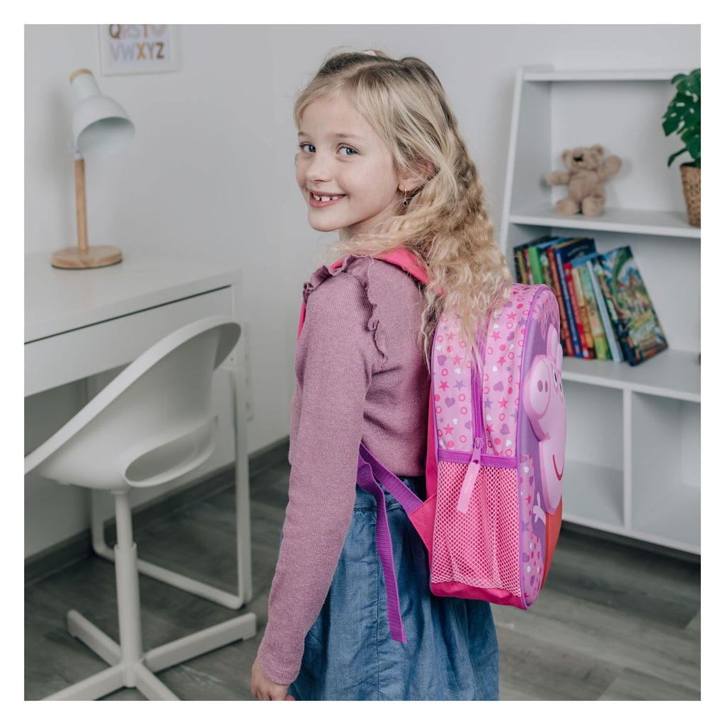 Deze Peppa Pig rugzak is perfect voor mee naar de opvang, naar school of mee op uitstapjes. Deze duurzame rugzak heeft een groot hoofdvak met verbrand om je spullen veilig in op te bergen. Aan de zijkant zitten mesh zijvakken, waar je nog meer in kunt opbergen. De gewatteerde schouderbandjes zijn verstelbaar en kunnen zo aangepast worden dat de rugzak altijd comfortabel draagt. Met een draaglus aan de bovenkant is het ook gemakkelijk om in de hand te dragen en op te hangen op school. In blauwe uitvoering, met 3D-look afbeelding van jouw vriendin Peppa op de voorkant. Afmetingen: 30 bij 25 bij 10 cm. Materiaal: polyester. Geschikt voor kinderen vanaf 3 jaar.