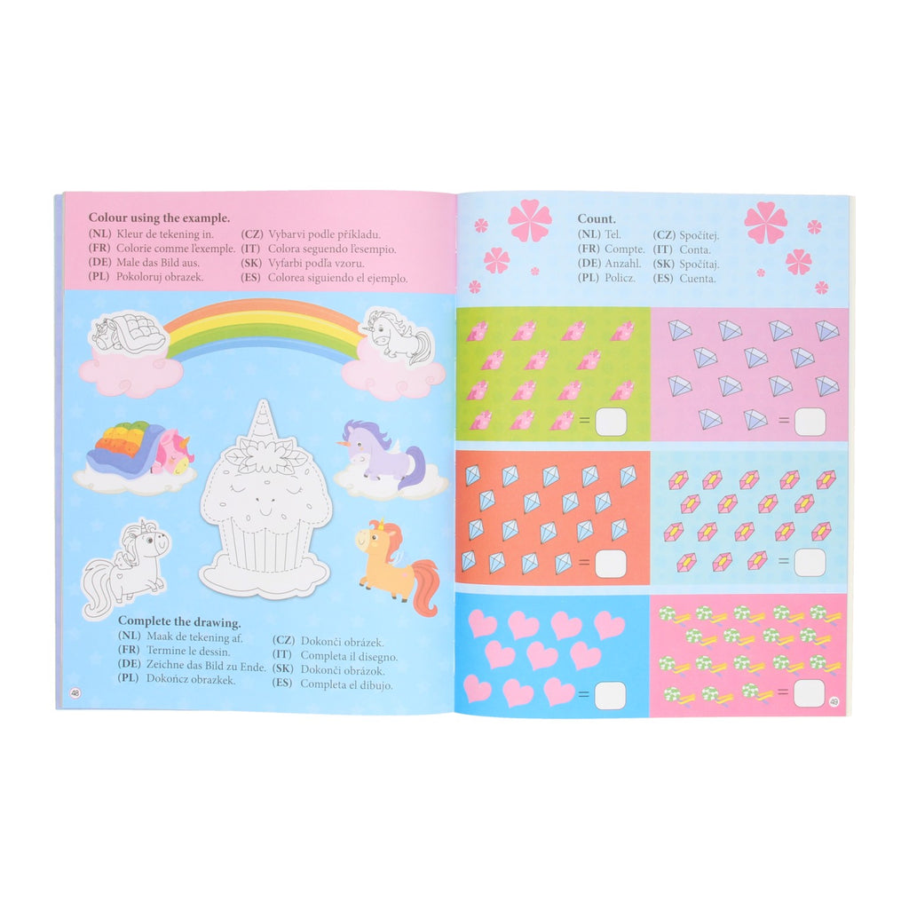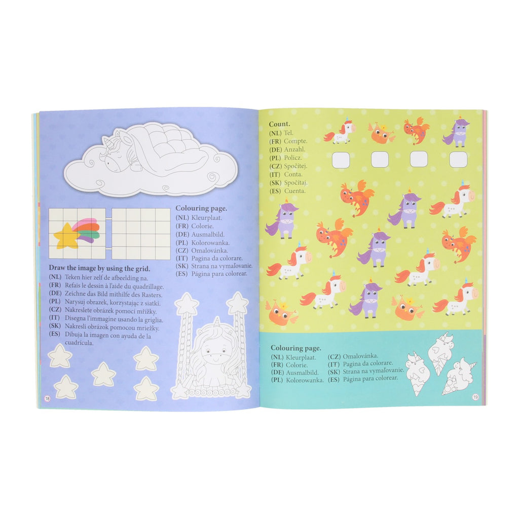 Activiteitenboek in unicornthema, met verschillende spelletjes, puzzels en kleurplaten.