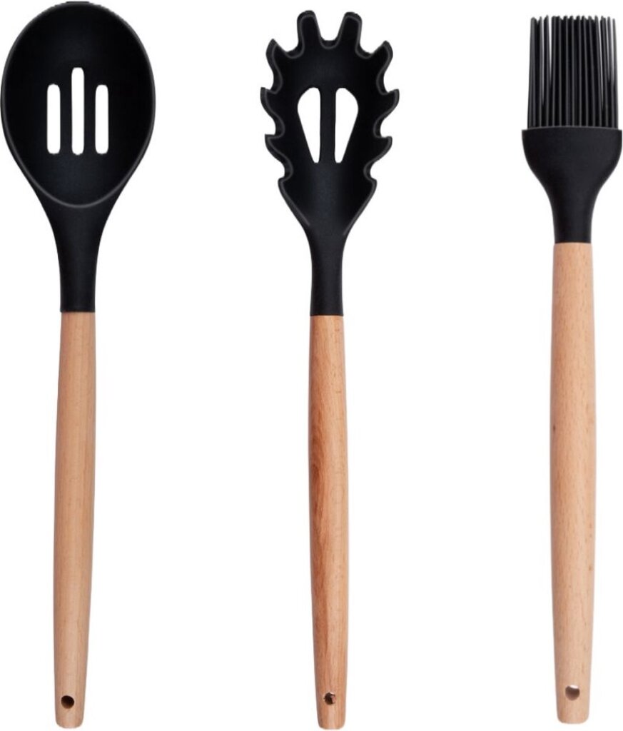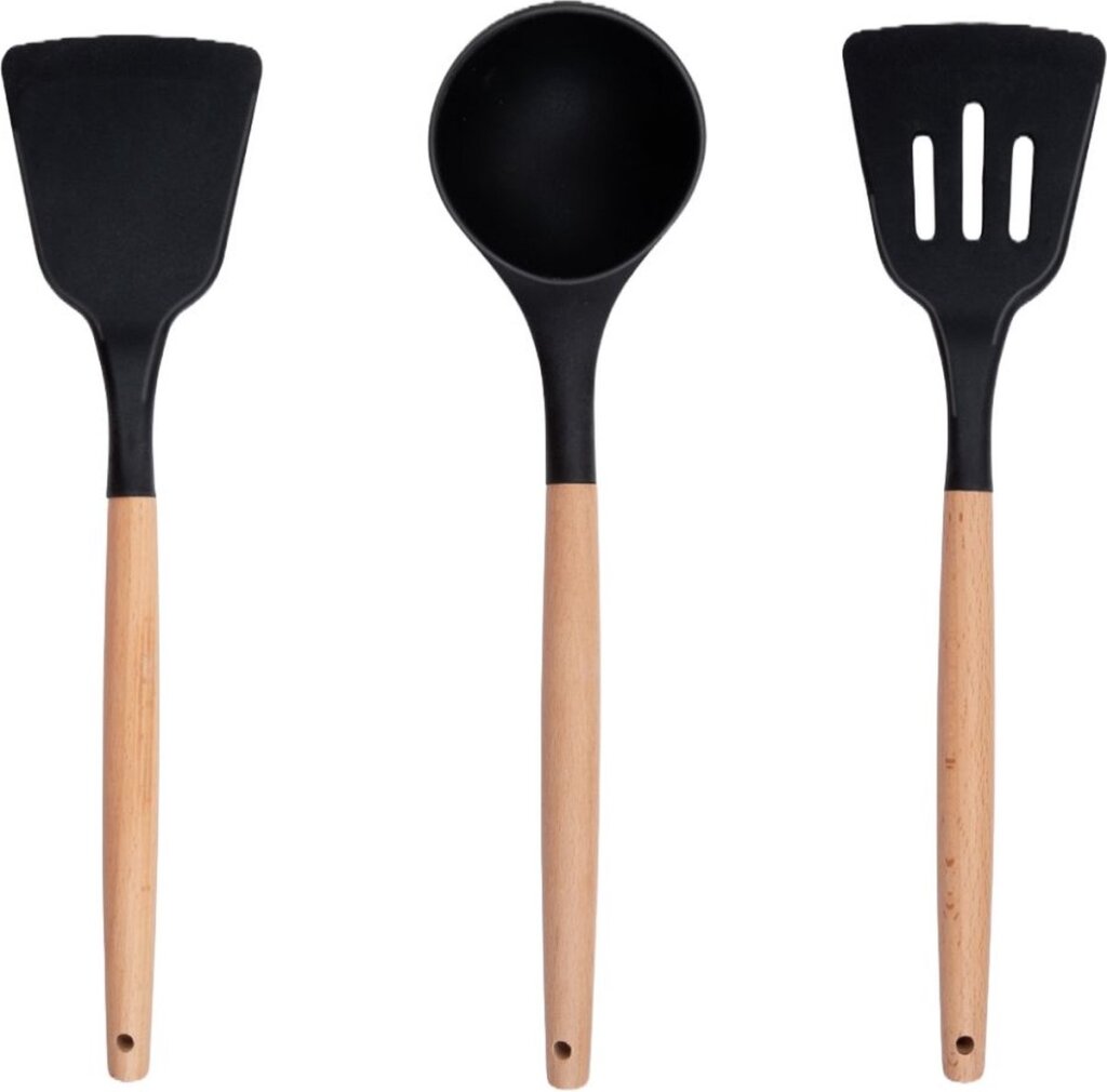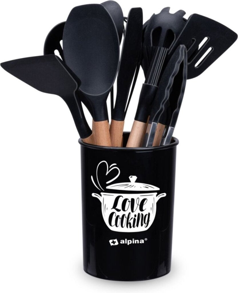 Alpina Keukengerei Set met Houder 12 Stuks Siliconen Gerei met Houten Handvat Zwart