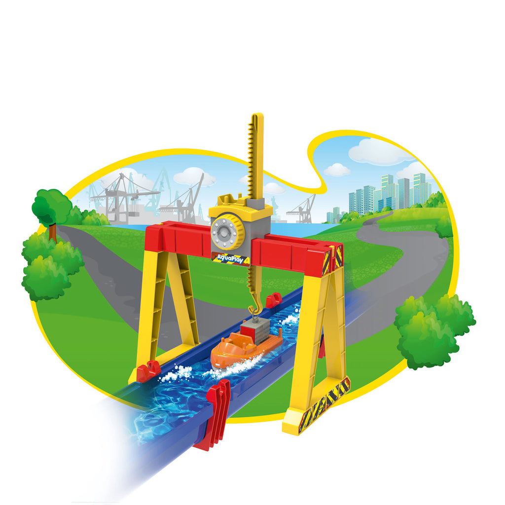 De AquaPlay 124 - containerkraanset is te gebruiken in combinatie met de waterbanen van AquaPlay. De set bestaat uit een brug met een feitelijke kraan, een bootje en een container. Door middel van de kraan kunnen containers van voorbij varende bootjes worden opgetild en weer in andere bootjes worden gezet. De onderdelen van deze AquaPlay containerkraanset zijn gemaakt van stevig kunststof en geschikt om mee in het water te spelen.