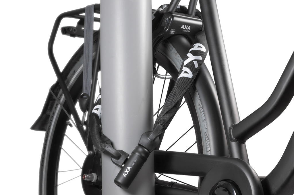 "Om ervoor te zorgen dat jouw fiets niet gestolen wordt, adviseren wij altijd om 2 verschillende sloten te gebruiken. Fietsendieven hebben vaak één specialisme en laten vaak een fiets met twee sloten staan. Daarom hebben wij nu de ideale set voor jou: het AXA Solid Plus ringslot en de Linq City ketting. Deze set biedt niet alleen extra veiligheid door de twee aparte sloten, maar is ook gebruiksvriendelijk omdat beide sloten met dezelfde sleutel kunnen worden. Geen gedoe meer met verschillende sleutels! Het AXA Solid Plus ringslot is een Een hoogwaardig frameslot dat de mogelijkheid biedt om een plug-in kabel of ketting in de zijkant van het slot te steken en zo je fiets aan een groot object te verbinden. Dit slot biedt optimale beveiliging dankzij de anti-boorcilinder en de geharde stalen beugel. Daarnaast zorgt het voor een ergonomische bedieningsknop voor maximaal comfort AXA Flex-houder stroken. De AXA Linq City 100 is een extra sterk slot door de schakels door tot in de sluiting. Deze kwalitatieve hoogwaardige ketting is uiterst geschikt voor extra beveiliging van je fiets. De laatste schakel van de ketting wordt gefixeerd in het slothuis door een zogenaamde 'deadbolt' sluiting voor een extra stevige verbinding. De rubberen grepen aan het slothuis zorgen voor extra grip tijdens het bedienen van het slot. De AXA Linq City heeft een lengte van 100 cm en wordt geleverd met een zwarte hoes. Mocht het gebeuren dat je fietssleutel kwijt bent, dan is dat geen probleem. Een extra sleutel kan via de AXA online sleutelservice besteld worden en wordt binnen enkele dagen geleverd. Productspecificaties - Solid Plus: Beveiligingsniveau 11 - Solid Plus: Voldoet aan de Nederlandse ART 2 sterren norm - Solid Plus: Goedgekeurd voor fietsverzekering in NL/UK - Solid Plus: Maximale beveiliging deur extra plug-in mogelijkheid - Solid Plus: Kinderbeveiliging - Linq City: Beveiligingsniveau 9 - Linq City: Anti-boorplaat in cilinder - Solid Plus: Ergonomische bedieningsknop - Linq City: Soepel sluitingsmechanisme - Linq City: Afgewerkt met rubberen grepen - Linq City: Sterke beschermhoes - Solid Plus: Gehard stalen beugel en slothuis - Solid Plus: Anti-boorplaat in de cilinder - Solid Plus: Montage middels flexibele bevestiging, ook afwijken voorde framebuizen - Linq City: Lengte 100 cm - Linq City: Diameter schakels Ø 7 mm - Linq City: Symmetrische sleutel"