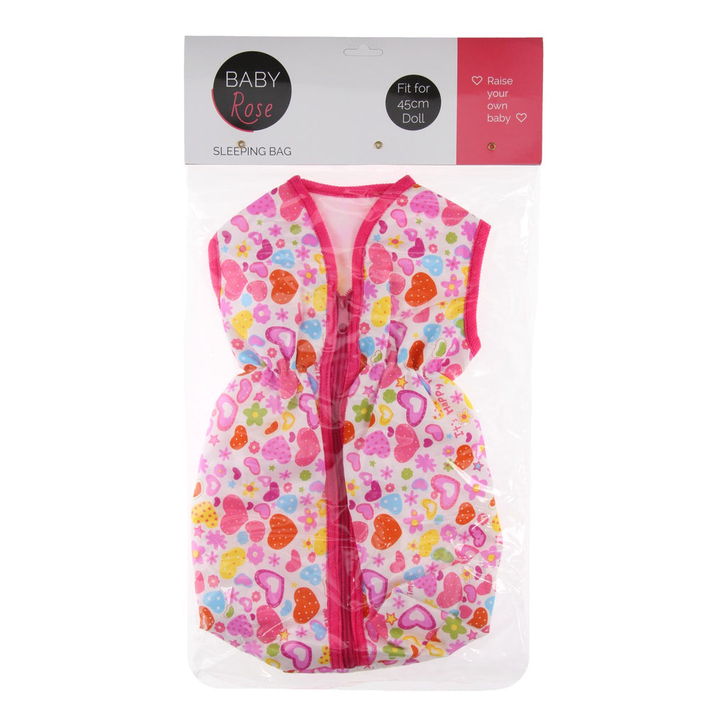 Deze slaapzak van Baby Rose zorgt ervoor dat je pop heerlijk kan slapen. De slaapzak heeft een roze rits en een kleurrijke patroon van hartjes en bloemen. Hij is geschikt voor poppen met een lengte tot en met 45 cm. Bovendien is de slaapzak merkvertragend.