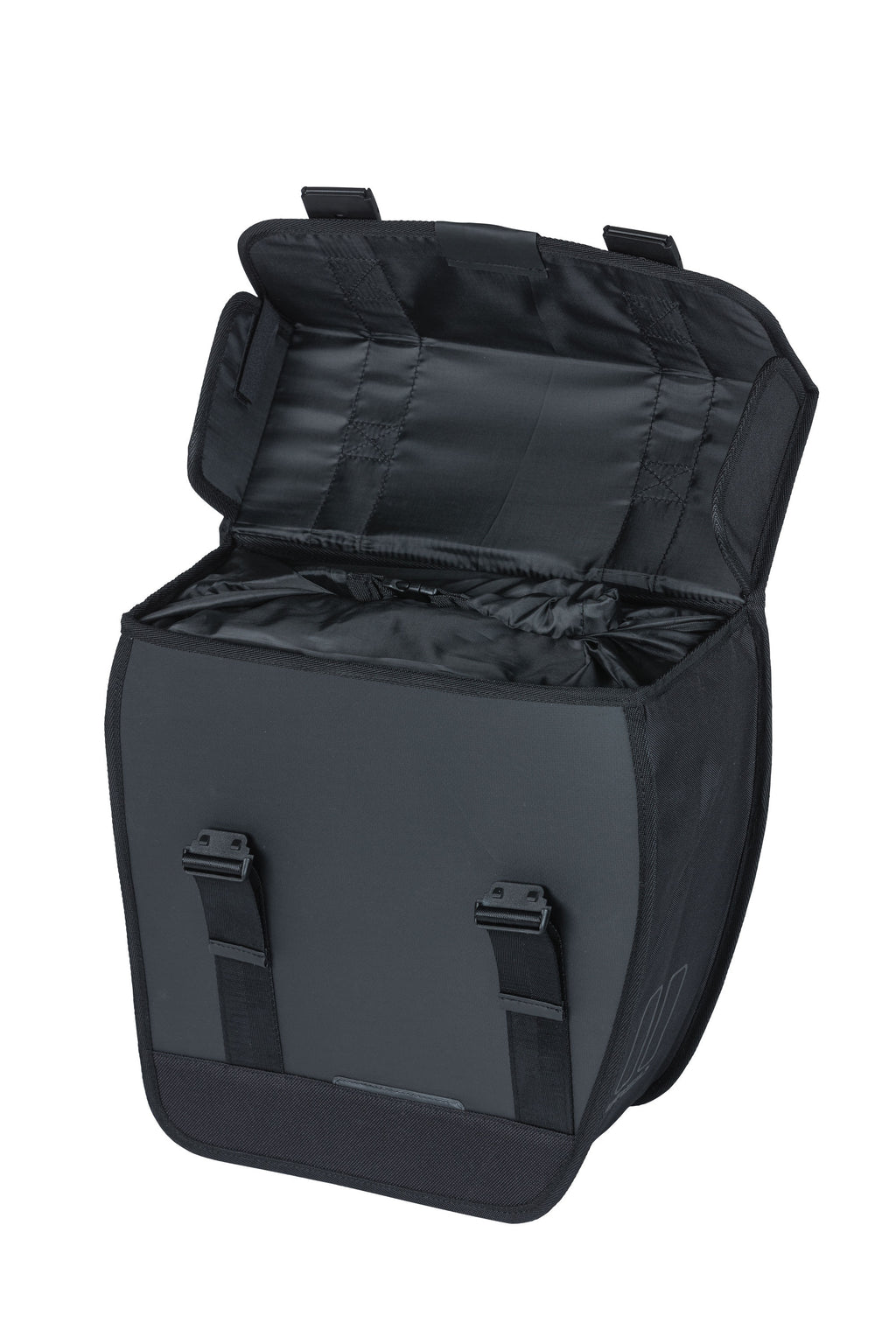 De Basil Tour is een zwarte, enkele fietstas in een waterdichte uitvoering. Deze enkele tas is geschikt voor bevestiging aan de rechterzijde van de fiets. De tas heeft een moderne uitstraling en een totale inhoud van 14 liter, waardoor er voldoende ruimte is voor je spullen tijdens een dagtocht of voor een kleine boodschap. Gemaakt van hoogwaardig 600D polyester in combinatie met zeildoek, is waterdicht en beschermt je spullen tegen regen. De roltopsluiting en regenoren zorgen ervoor dat jouw spullen droog blijven, zelfs tijdens een regenbui. Met een vormvast en robuust handvat is het comfortabel om te dragen. Dankzij het Hook On-systeem is het eenvoudig te bevestigen aan je (elektrische) fiets. Productspecificaties - Model: Achtertas - Dubbel of enkel: Enkel - Afmetingen: 34 x 14 x 34 cm (Buitenwerkse maten) - Volume (Ltr): 14,0 - Geschikt voor: Elektrische fiets, stadfiets, city-trekking fiets - Materiaal: Polyester - Kleur: Zwart - Systeem: Basil Hook-On systeem - Ook te gebruiken als: Handtas - Toepassing: Bagagedrager - Extra vak voor: Nvt - Sluiting hoofdvak: Kliksluiting - Laptopvak: Nee - Zijvak(ken): Nee - Voorvak(ken): Nee - Diefstalbeveiliging: Nee - Waterbestendig: Waterdicht - Snelbinders mogelijk: Ja - Afneembaar: Ja - Handvat: Ja - Draagcapaciteit: Max. 5 kg - Garantie: 2 jaar - Binnenvak: Nee