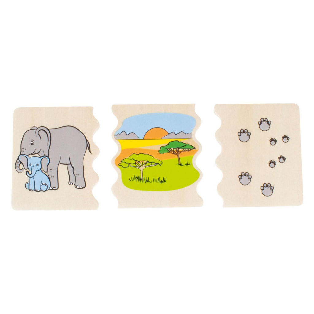 Houten puzzel waarbij kinderen leren om verbanden te leggen tussen dieren, hun leefomgeving en hun pootafdrukken.