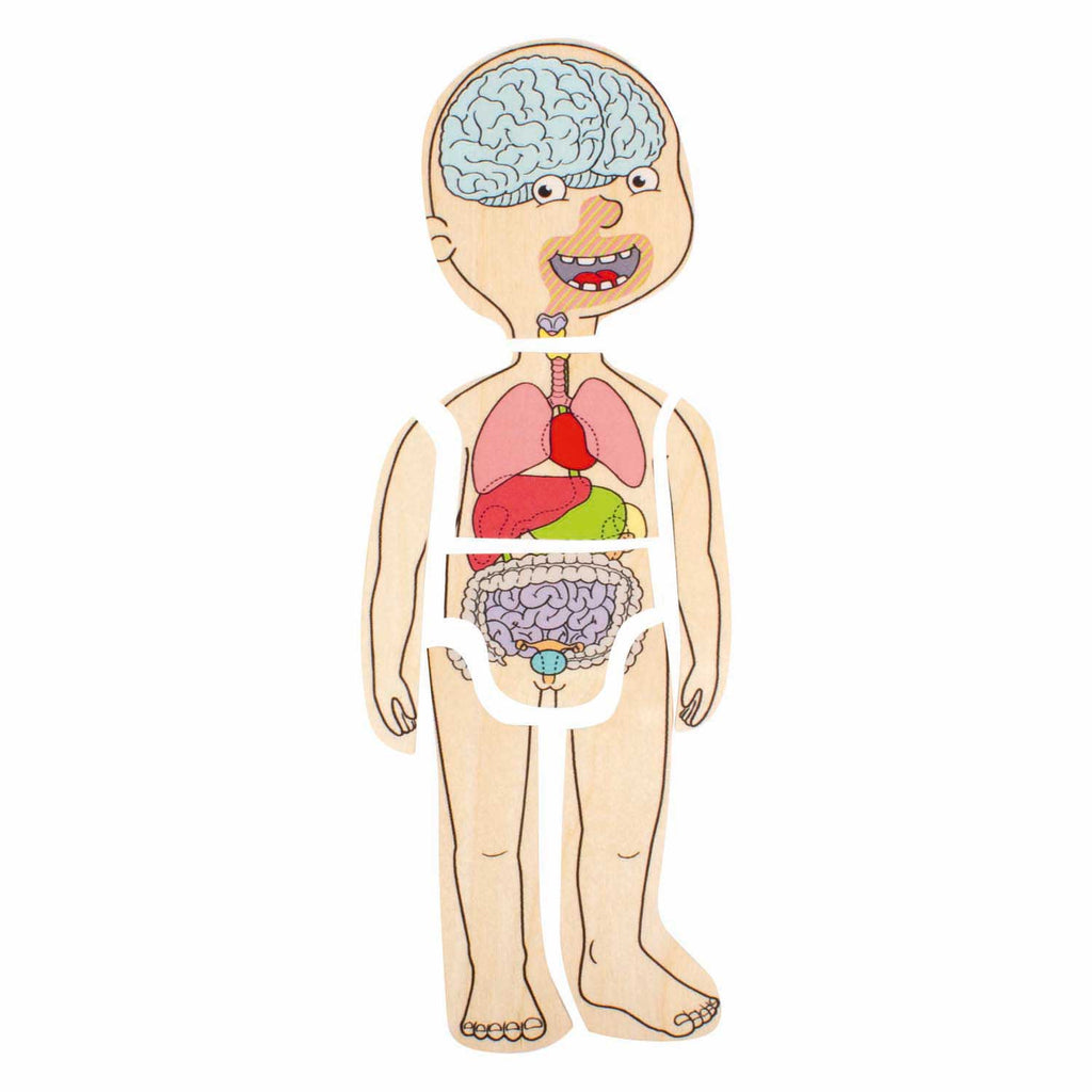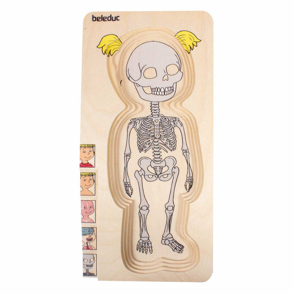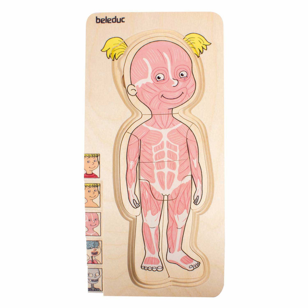 Houten laagjespuzzel van een meisjeslichaam met 5 lagen: kleding, huid, spieren, organen en skelet. Leerzaam en stevig. Vanaf 4 jaar.