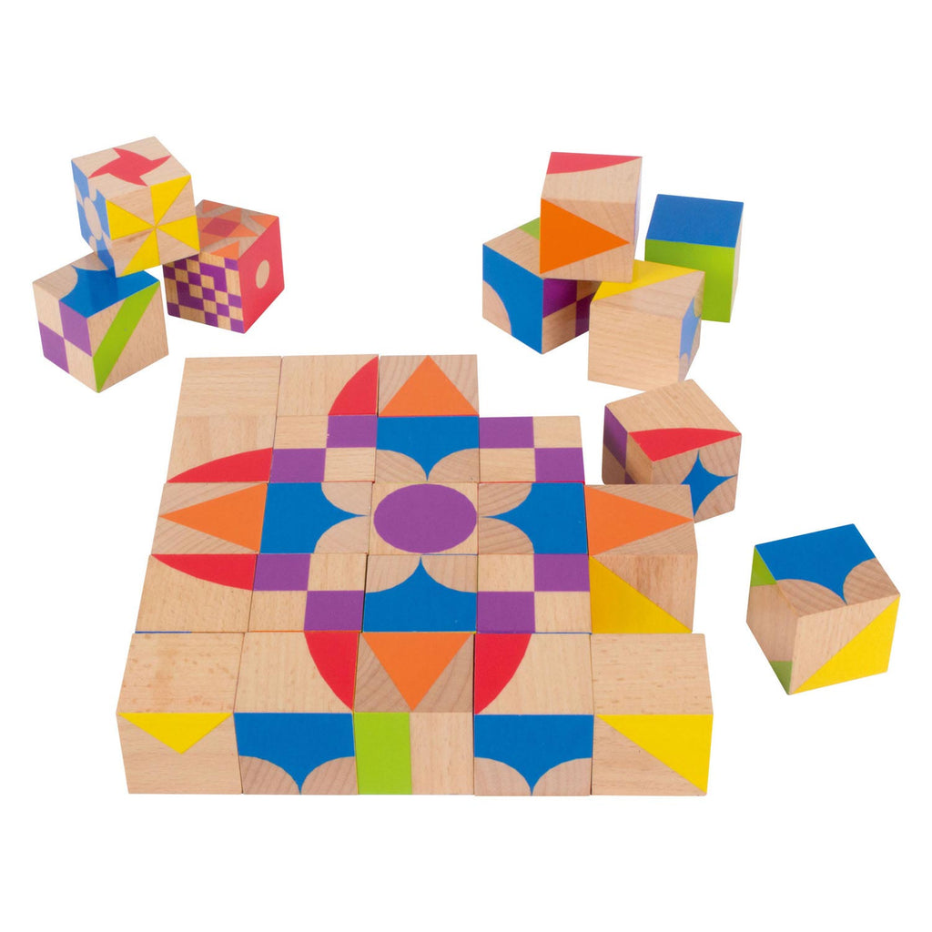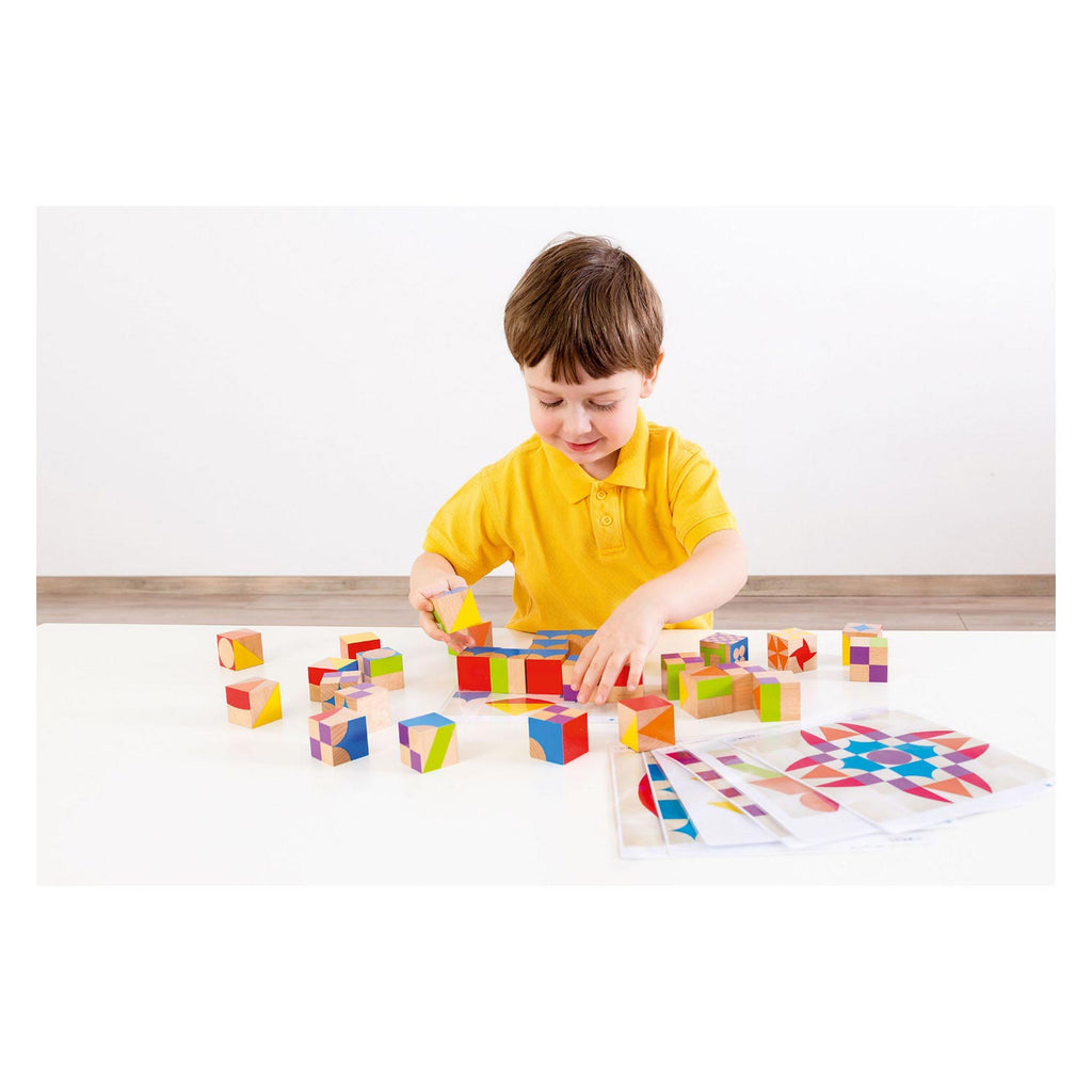 Houten blokken met kleurrijke figuren waarmee je kleurrijke mozaïeken kunt vormen. Inhoud: 41 blokken. Geschikt vanaf 4 jaar.