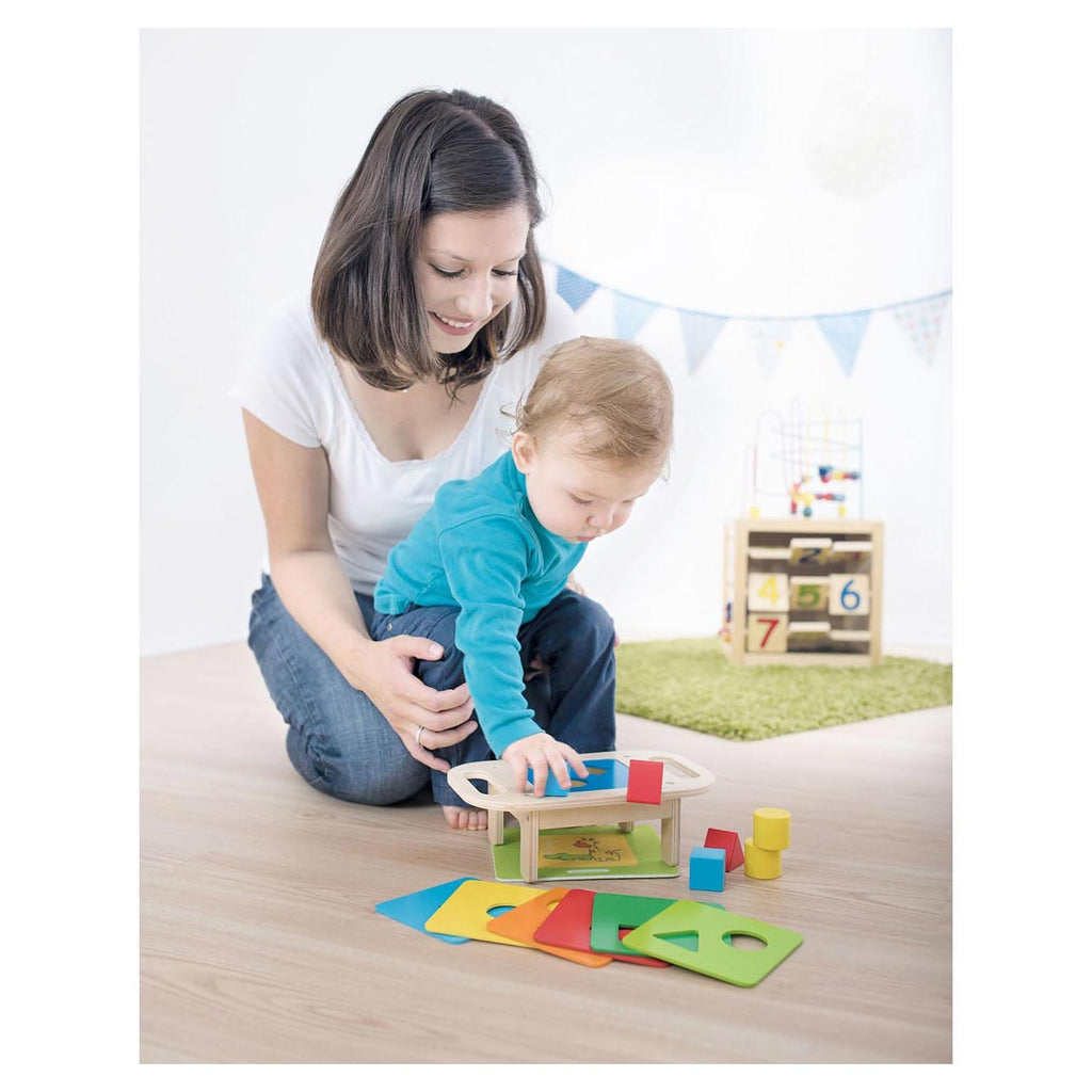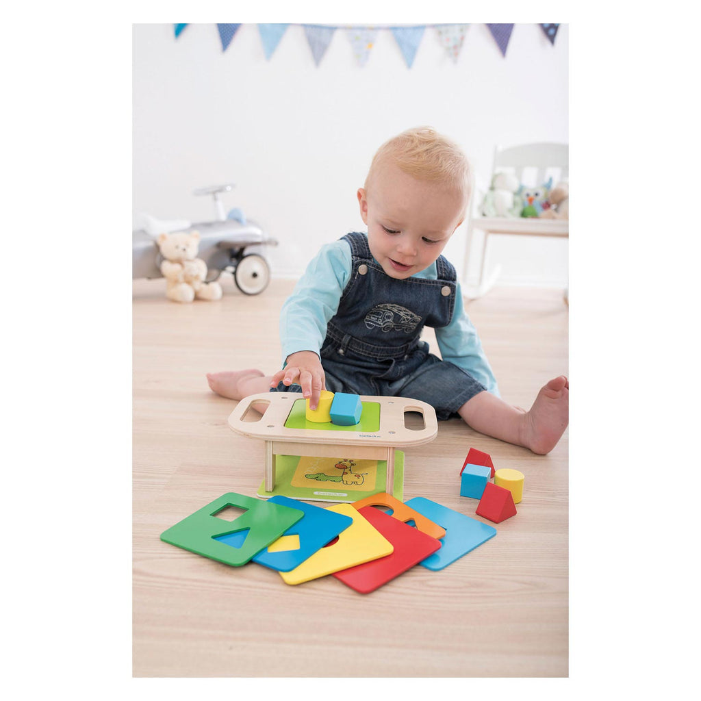 Beleduc's houten vormensorteerder is een leuk en educatief spel voor kinderen vanaf 12 maanden. Het spel helpt bij het ontwikkelen van hand-oogcoördinatie en fijne motoriek, en geïntroduceerde kleuren en geometrische vormen.