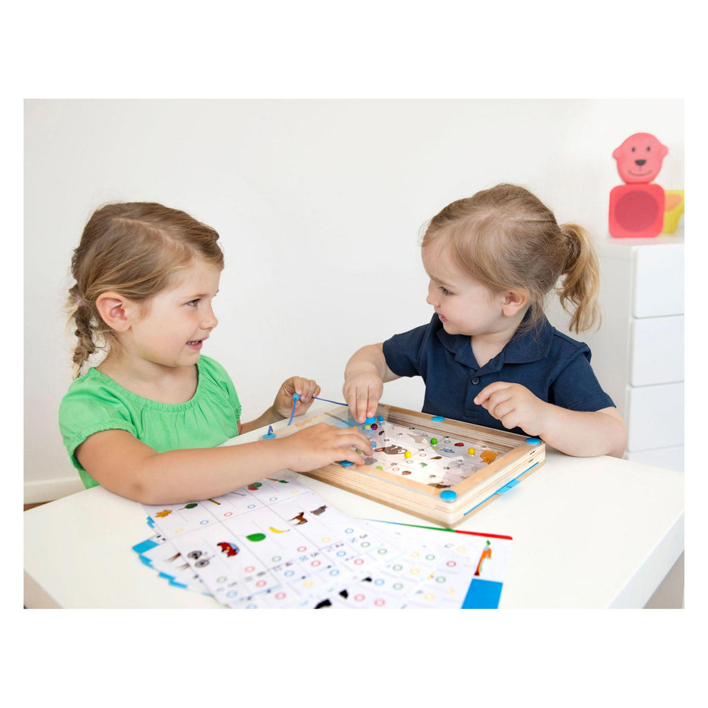 LogiPlay is een magneetspel dat geschikt is voor kinderen van 4 tot 8 jaar. Het kan al bij leeractiviteiten in de vroege ontwikkeling worden gebruikt. Het spel bestaat uit een houten lijst met een magneetpen en een kaartenset met 18 verschillende opdrachten. De opdrachten worden weergegeven op de voorkant van de kaart en de magneetpen wordt gebruikt om de elektrische ballen in het juiste antwoordgat te plaatsen. De opdrachtkaarten bevatten activiteiten zoals kiezen, associëren, voltooien, vergelijken en tellen. Met de voorkeur op de achterkant van de kaarten kunnen kinderen hun antwoorden controleren. Het magneetspel is ideaal voor gebruik in de kinderopvang en biedt veelzijdige toepassingen. Het compacte ontwerp maakt het spel gemakkelijk mee te nemen en snel op te ruimen.