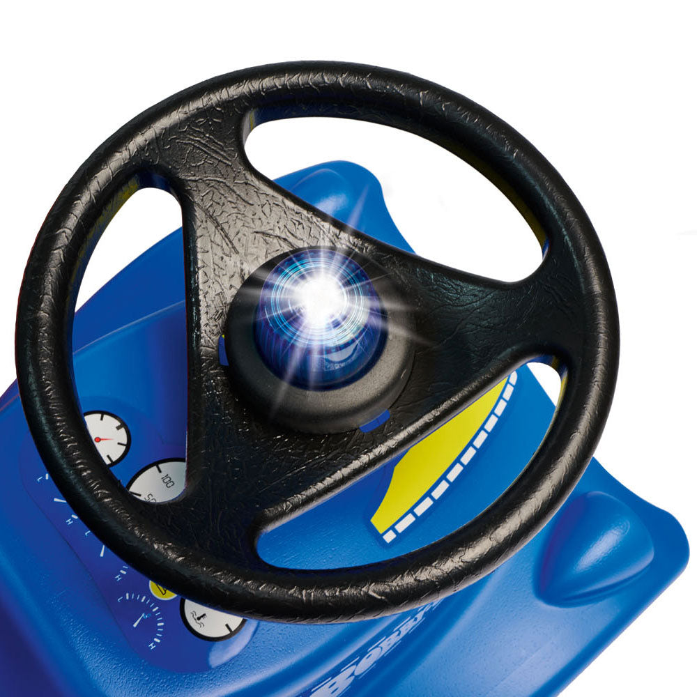 Blauwe loopauto met politiestickers en een knop op het stuur met sirene met blauw zwaailichteffect. Geschikt van 12 maanden tot ongeveer 3 jaar. Gemaakt van kunststof.