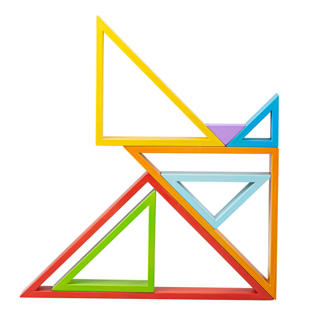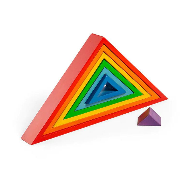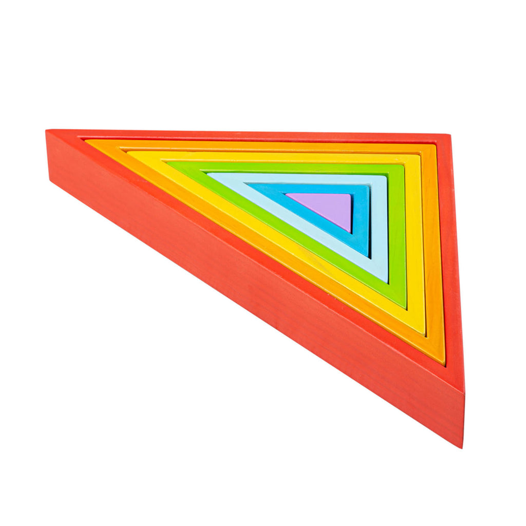 Regenboog stapeldriehoeken van hout. Gemaakt van massief hout en gekleurd met niet-giftige verf. Ontwikkelt creativiteit, beweeglijkheid en ruimtelijk redeneervermogen. Gemaakt van hoogwaardige, verantwoorde materialen. Voldoet aan de huidige Europese veiligheidsnormen. Kenmerken: - 7 regenboogkleurige driehoeken. - Gemaakt van massief hout en gekleurd met niet-giftige verf. - Afmetingen: 5,5 cm L x 21,4 cm H x 21,4 cm B. - Geschikt voor 3 jaar en ouder.