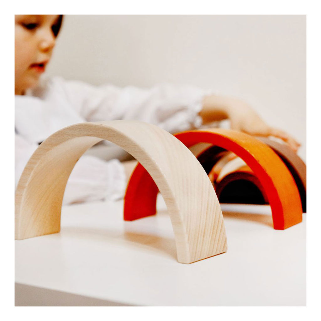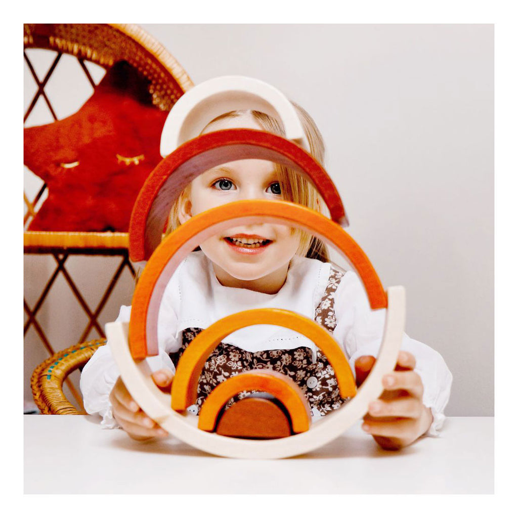 Met deze regenboog stapelblokken kunnen kleine handjes verschillende vormen en objecten in elkaar zetten terwijl ze alles leren over verschillende maten en kleuren. Ideaal voor het ontwikkelen van creativiteit en behendigheid. Als het spelen voorbij is, is de houten regenboog een mooie decoratie voor de slaapkamer of kinderkamer van je kleintje.De 11 houten bogen kunnen worden gestapeld en in oneindig veel dingen kunnen worden gebouwd: een brug, een tunnel, een halve pizza... De speelmogelijkheden zijn eindeloos. Gemaakt van hoogwaardig, duurzaam massief hout en gekleurd met niet-giftige natuurlijke schaduwverven. Voldoet aan huidige Europese veiligheidsnormen, geschikt voor 18 maanden +.