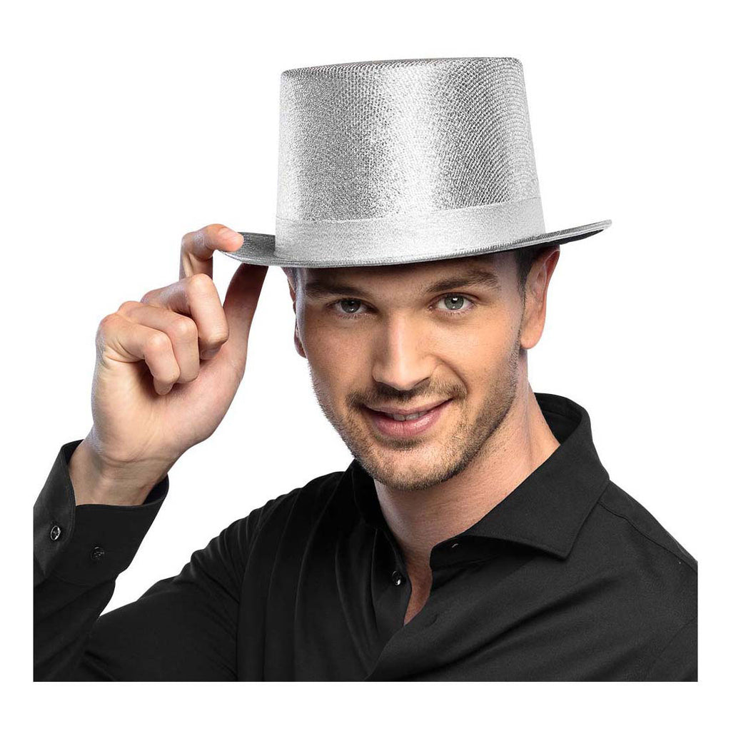 Zilveren hoed met glinsterende afwerking, gemaakt van 95% polyester en 5% polyurethaan. Hoofdomtrek circa 59 cm. Geschikt voor volwassenen.