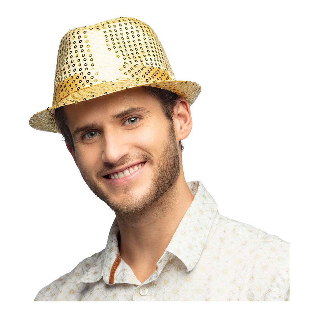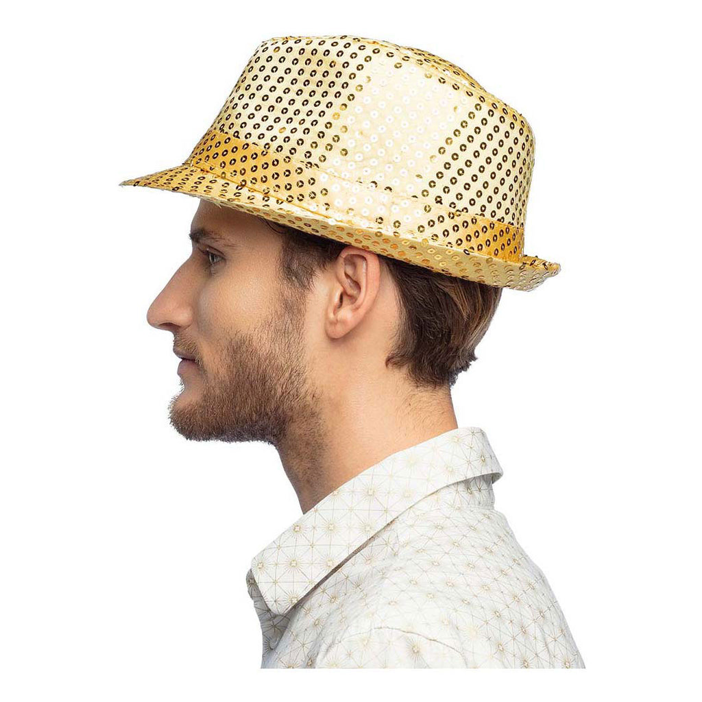 De Boland Hoed Popstar Sequins in goud is een sprankelende trilby-hoed versierd met pailletten, perfect voor feestelijke gelegenheden. Met een hoofdomtrek van circa 59 cm en geschikt voor volwassenen vanaf 14 jaar.