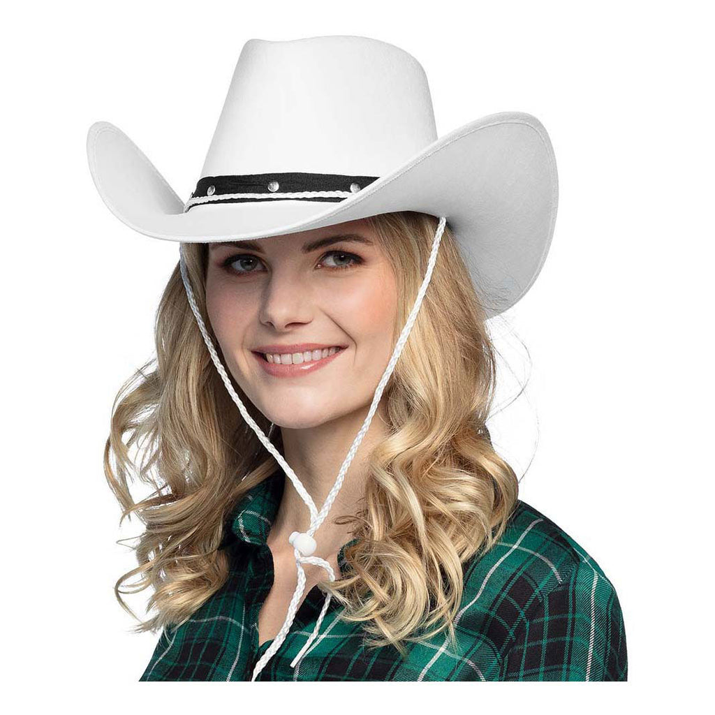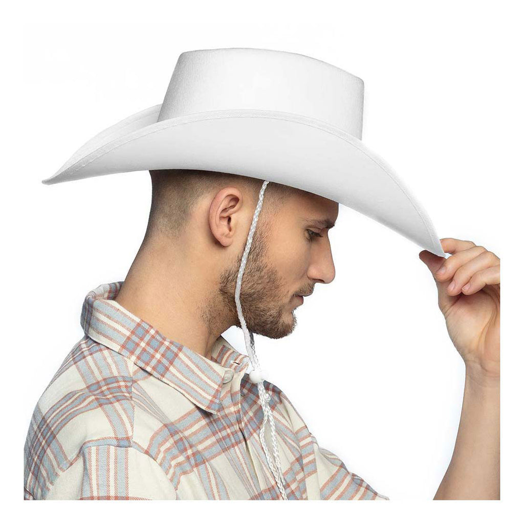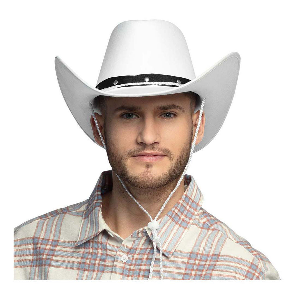 Witte cowboyhoed busje 100% polyester met een hoofdomtrek busje circa 59 cm. Geschikt vanaf 14 jaar.