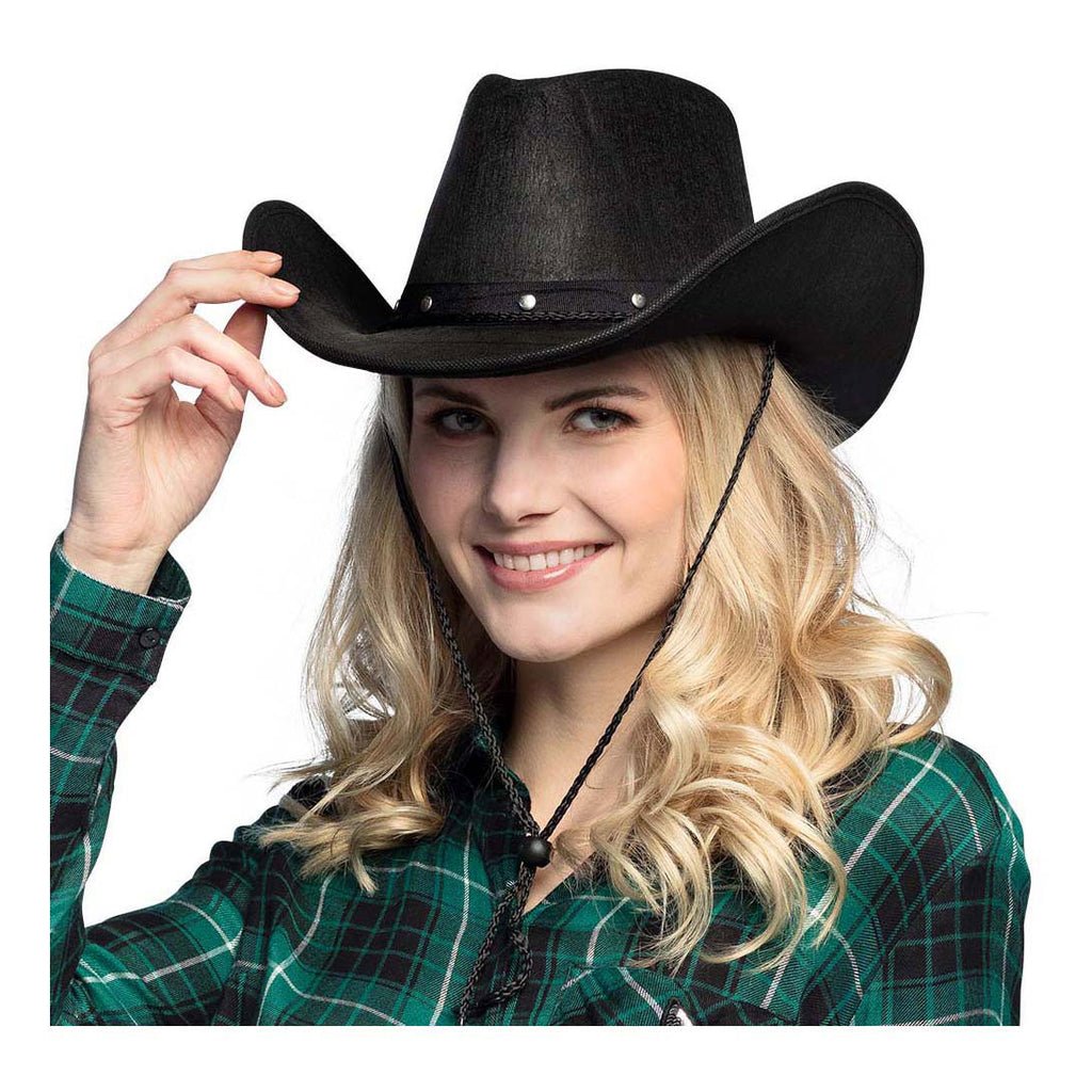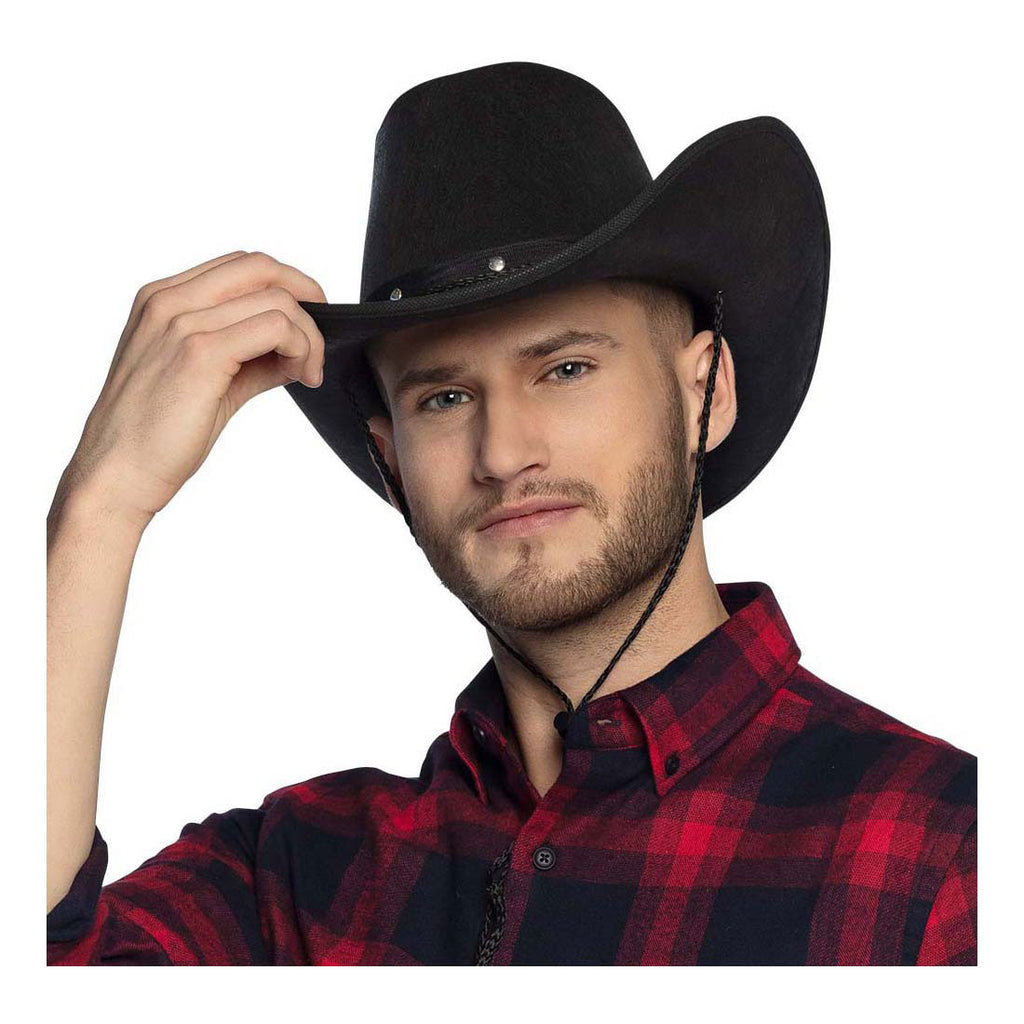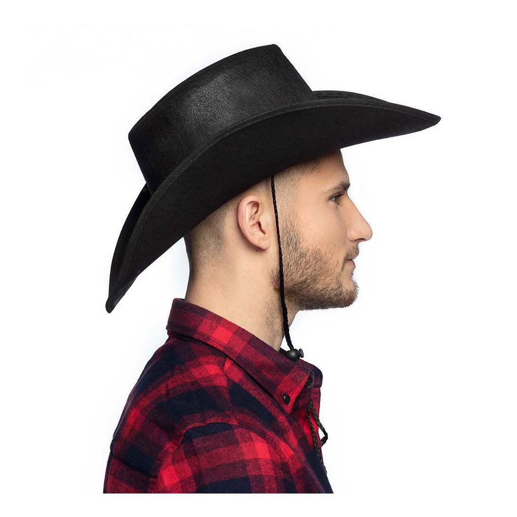 Zwarte cowboyhoed van 100% polyester met een hoofdomtrek van circa 59 cm. Geschikt vanaf 14 jaar.