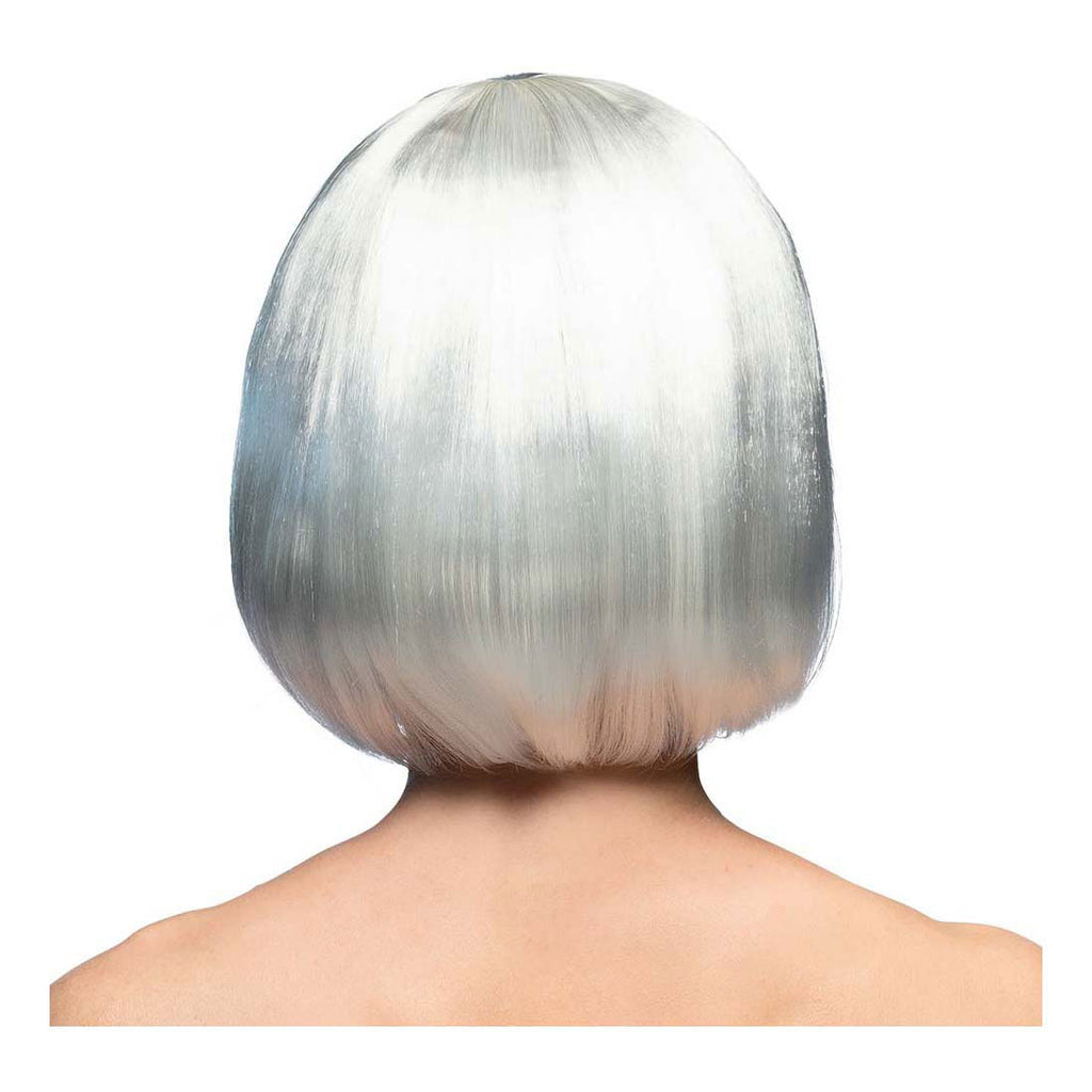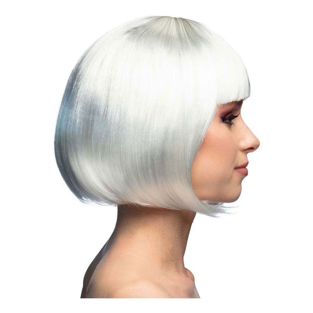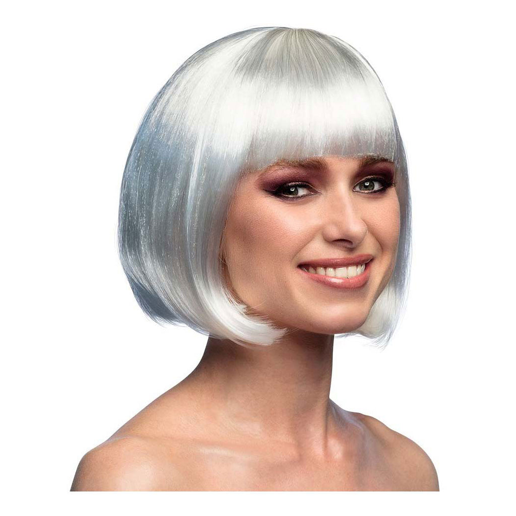 Steile, korte boblijnpruik in witte kleur, geschikt voor volwassenen. Perfect voor cabaret- of burlesque-themafeesten. Gemaakt van synthetisch materiaal voor een realistische uitstraling.