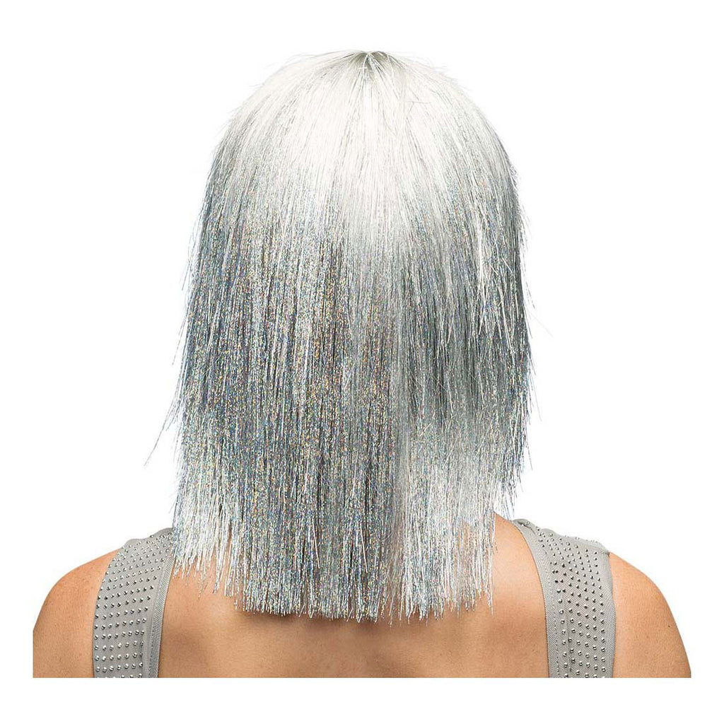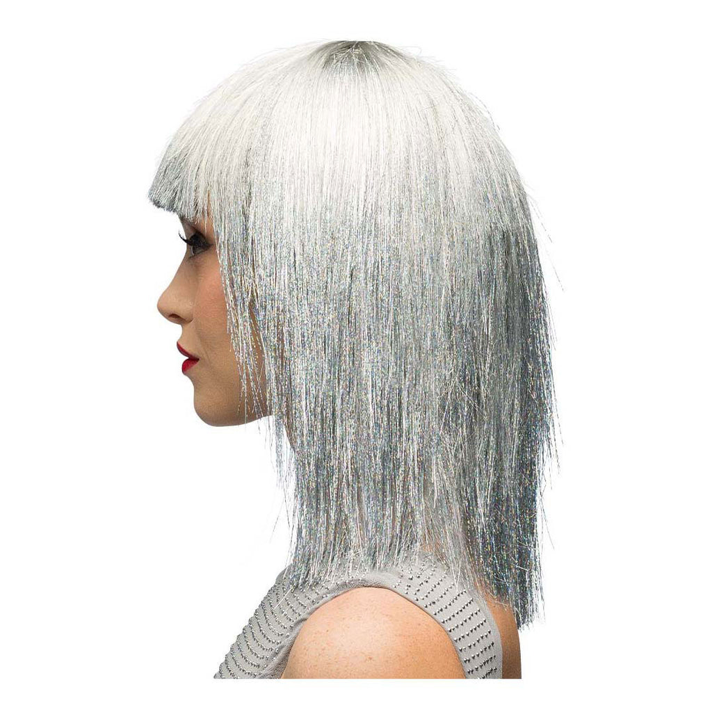 Halflange, metallic zilveren damespruik met stalen haar en rechte pony, gemaakt van kunststof. Comfortabele pasvorm voor volwassenen met een hoofdomtrek van circa 58 cm. Niet wasbaar en niet geschikt voor kinderen onder de 14 jaar.