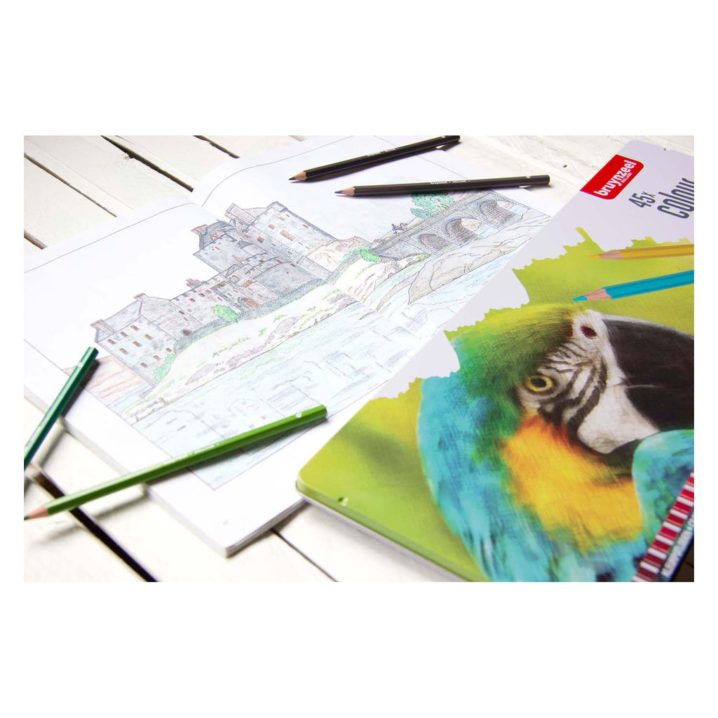 45 verschillende kleurpotloden met de bekende Bruynzeel-kwaliteit. De potloden zijn gemaakt van hoogwaardige pigmenten, zodat de potloden een mooie kleurweergave hebben en gemakkelijk met elkaar te mengen zijn. Dankzij de kern van 2,9 mm geniet je van extra lang kleurplezier. Alle potloden van Bruynzeel zijn glutenvrij en met zorg vervaardigd uit verantwoord verzonden hout. Daarnaast heb je Bruynzeel potloden een dubbele verlijming, waardoor deze extra sterk is en het risico dat de kleurkern breekt, bijvoorbeeld als het potlood op de grond valt, minimaal is! Dit voorkomt puntbreuk en zorgt ervoor dat je potlood zelden hoeft te slijpen.